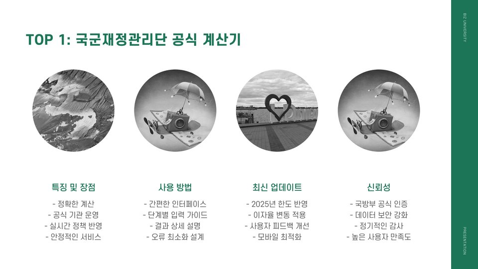 이제는 여러분이 효과적으로 사용할 수 있는 군적금 계산기 TOP 5를 소개하겠습니다. 이들 도구는 각기 다른 기능과 장점을 가지고 있으며, 사용자가 원하는 방식으로 군적금을 계산할 수 있도록 돕습니다.