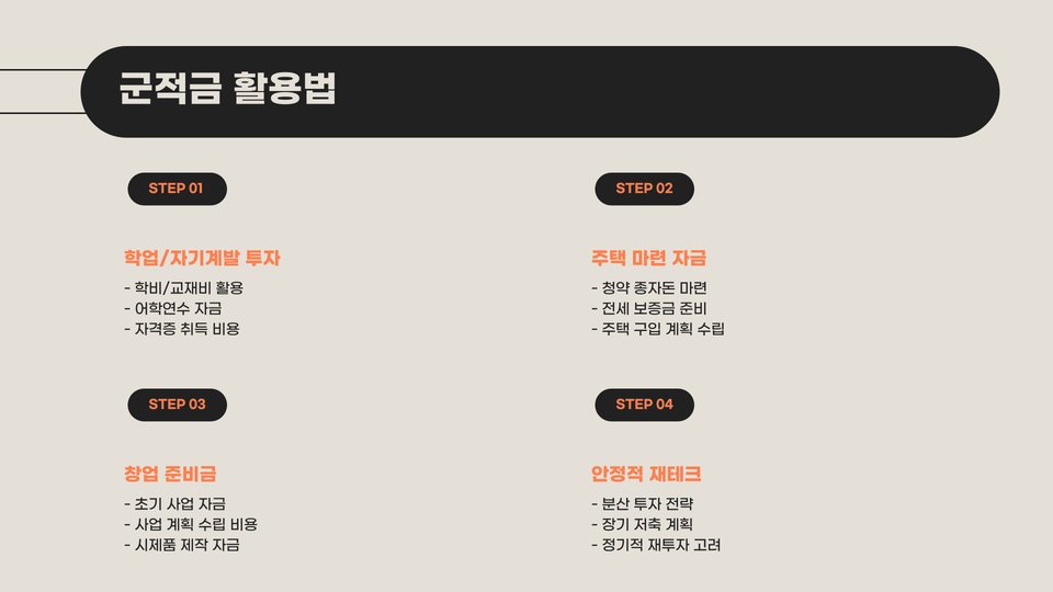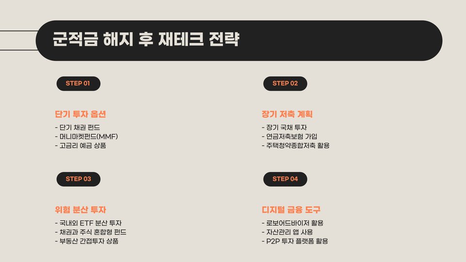 군적금을 해지한 후에는 받은 금액으로 어떻게 재투자할지를 고려해보는 것도 좋은 전략입니다. 적금 해지를 통해 생긴 자금을 어떻게 사용할 것이며, 향후 필요한 자금을 어떻게 계획할 것인지 미리 고민해보는 것이 중요합니다. 예를 들어, 전역 이후 학자금이나 취업 준비 자금으로 활용해보세요.