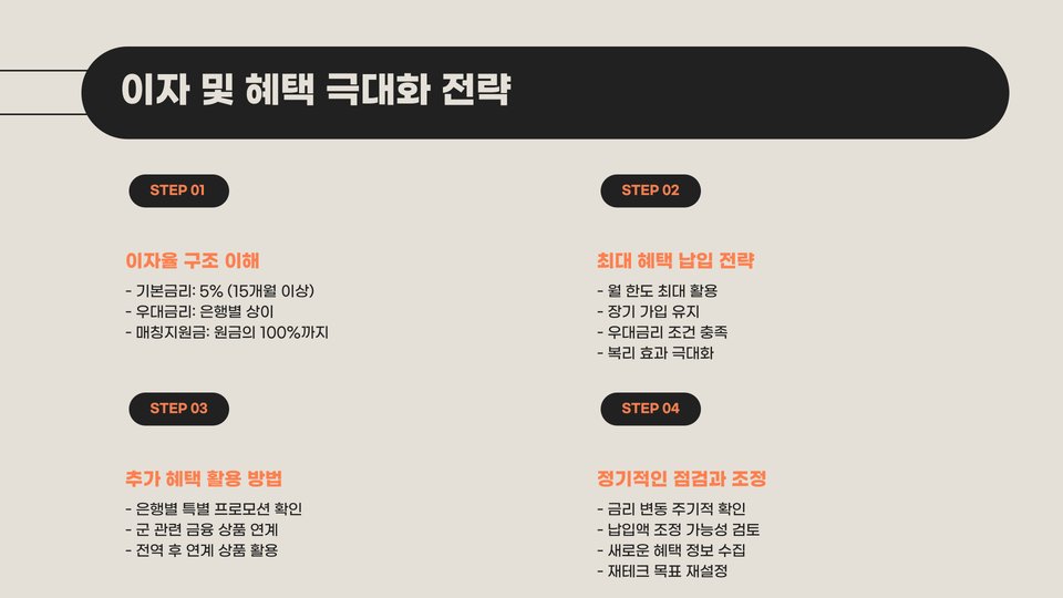 군적금은 군 복무 동안 안정적으로 목돈을 마련할 수 있는 좋은 방법 중 하나입니다. 군 적금의 대표적인 상품 중 하나는 장병내일준비적금입니다. 이 상품은 군인들이 군 복무 중에 매달 적금을 들어 전역 후 가벼운 마음으로 새로운 시작을 할 수 있도록 돕기 위해 설계되었습니다. 하지만 적금을 해지하는 과정에서도 몇 가지 단계별로 성공적인 방법을 이해하고 준비해야 합니다.