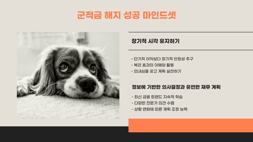 이렇게 군적금 해지 방법론을 쉽게 정리해보았습니다. 군 복무 중에는 많은 것들이 바쁘고 복잡할 수 있지만, 군적금 해지는 현명하게 준비하고 진행하는 것이 중요합니다. 이를 통해 전역 후 원활한 사회 생활이 시작되기를 바랍니다.