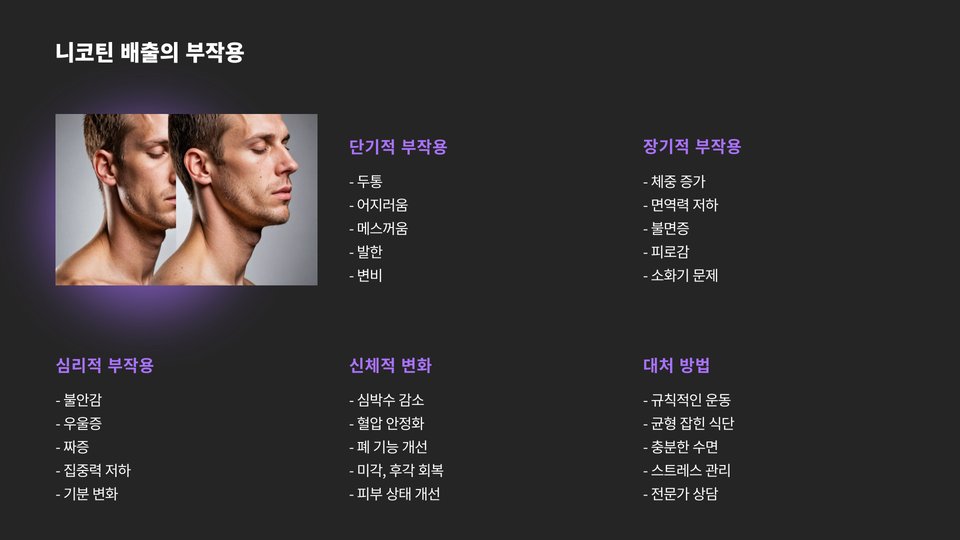 니코틴을 배출하는 과정에서는 몇 가지 부작용이 나타날 수 있습니다. 첫 번째는 금단 증상입니다. 흡연에 의존했던 사람은 금연 후 불안, 우울, 그리고 집중력 저하와 같은 증상을 경험할 수 있습니다. 이러한 증상은 일반적으로 시간이 지나면서 자연스럽게 사라지지만, 초기에는 힘들 수 있습니다.