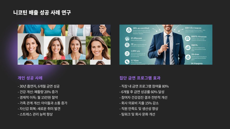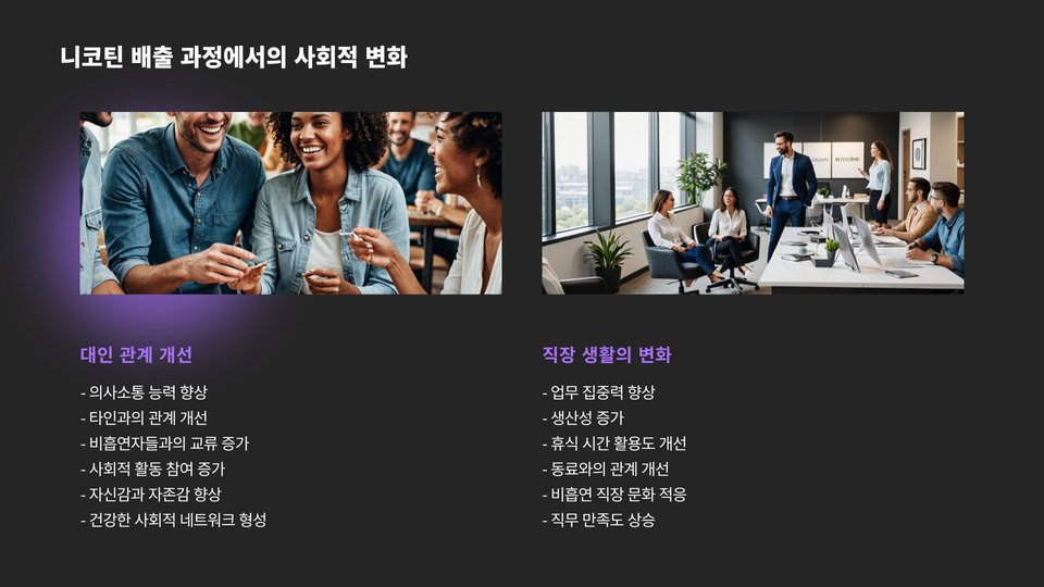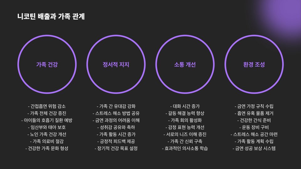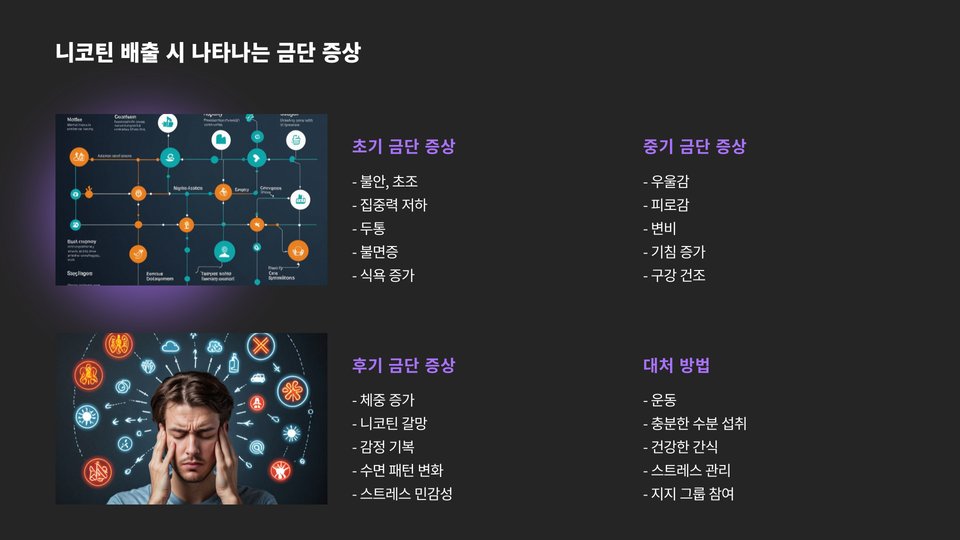 마지막으로, 니코틴을 배출하려는 과정에서 중요한 것은 주변의 의지와 지원입니다. 친구나 가족의 지지, 전문 상담사와의 상담은 금연에 큰 도움이 될 수 있습니다. 혼자서 이겨내기 어려운 감정과 증상을 함께 나누는 것이 중요합니다.