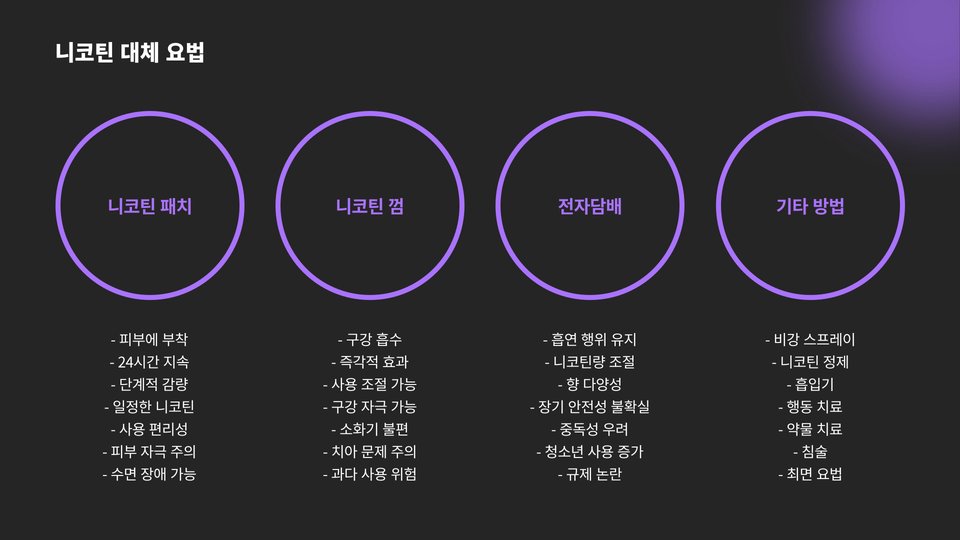 - 금단 증상 및 체중 증가와 같은 부작용이 있을 수 있다.