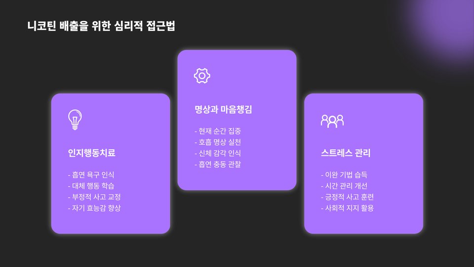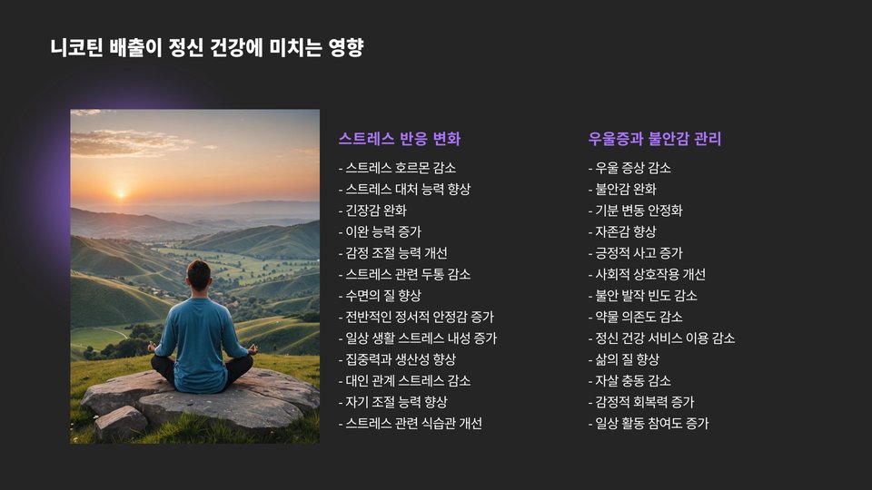 둘째, 정신적으로도 긍정적인 영향을 미칩니다. 니코틴이 체내에서 배출되면 스트레스와 불안이 감소하는 경험을 할 수 있습니다. 많은 흡연자들이 니코틴을 통해 일시적인 안정을 느끼지만, 실제로는 니코틴이 배출되면서 더 많은 에너지를 얻고 정신적인 안정감을 찾을 수 있습니다.