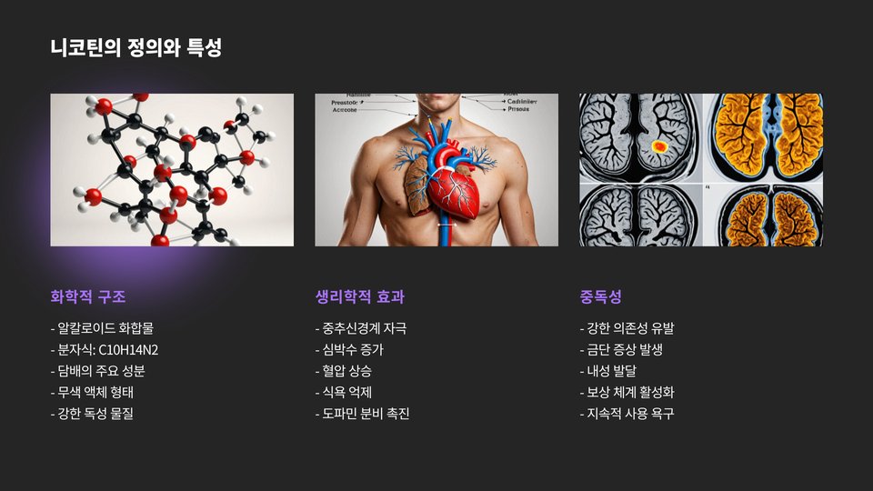 니코틴은 흡입 시 혈류로 빠르게 흡수되어 다양한 신체 시스템에 영향을 미칩니다. 먼저 아드레날린의 방출을 촉발하여 신경계를 자극하고, 이로 인해 심박수가 증가하게 됩니다. 이는 단기적으로 신체의 긴장 상태를 유발하고, 결국에는 심리적, 신체적 중독으로 이어지게 됩니다. 이러한 중독은 금연을 시도할 때 더 큰 장애물로 작용합니다.