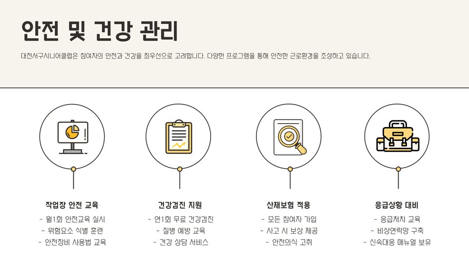 이곳은 대전의 다른 시니어클럽에 비해 훨씬 더 현대적인 환경을 갖추고 있어, 쾌적하고 편안한 시설에서 활동할 수 있습니다. 이 클럽에서는 친구들과의 만남과 교류를 중요시하며, 친목 모임도 활성화되어 있습니다.