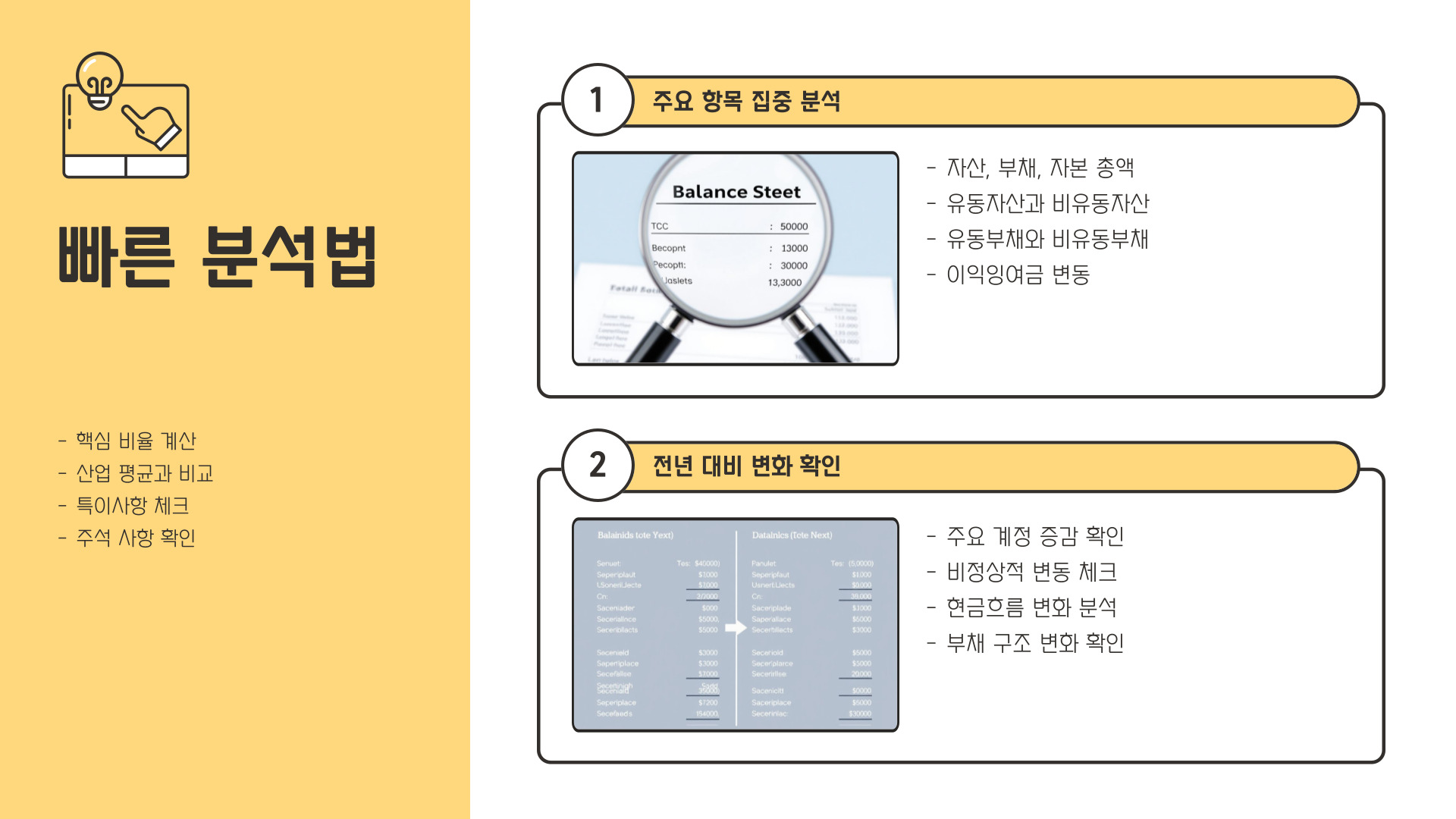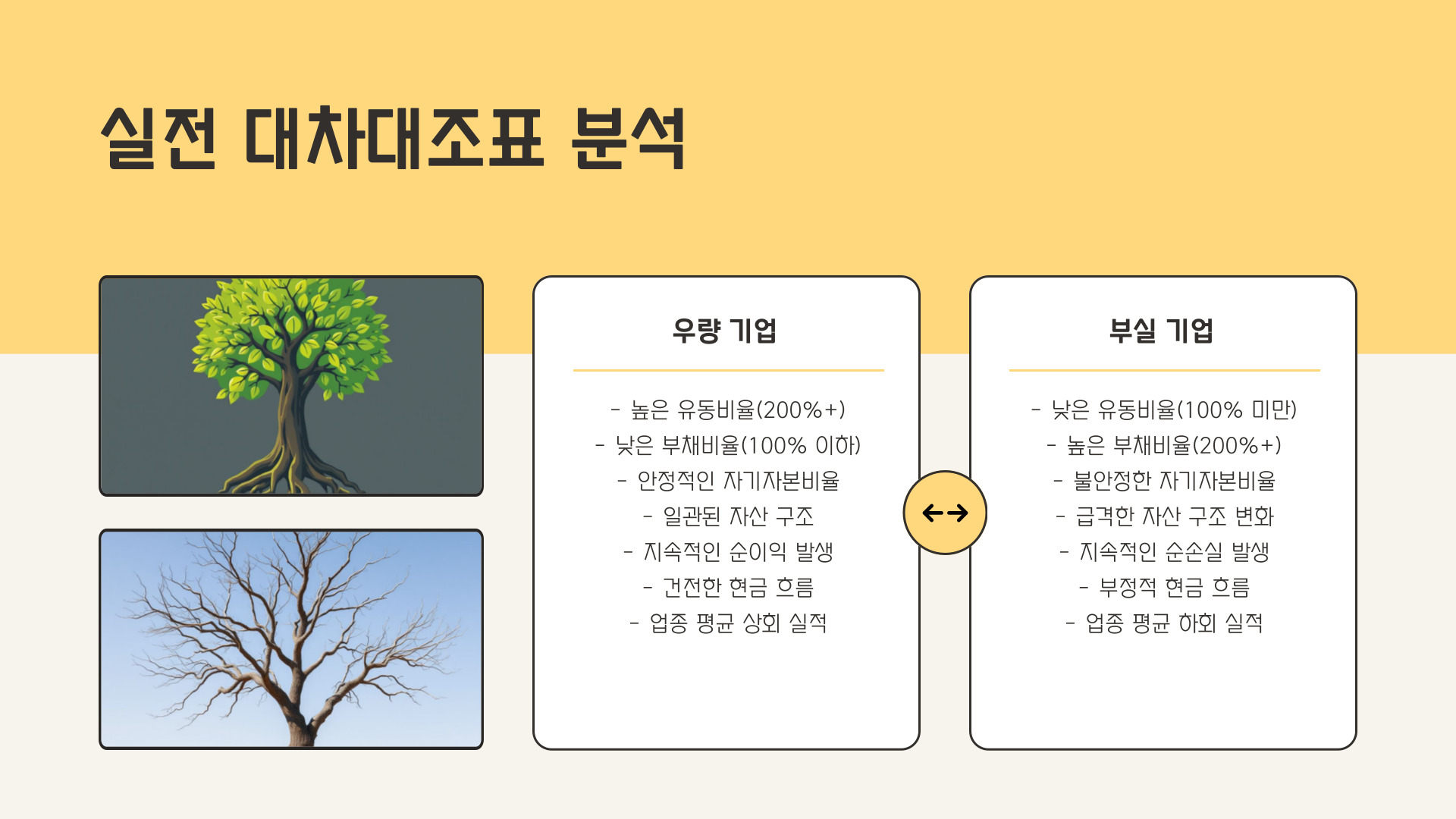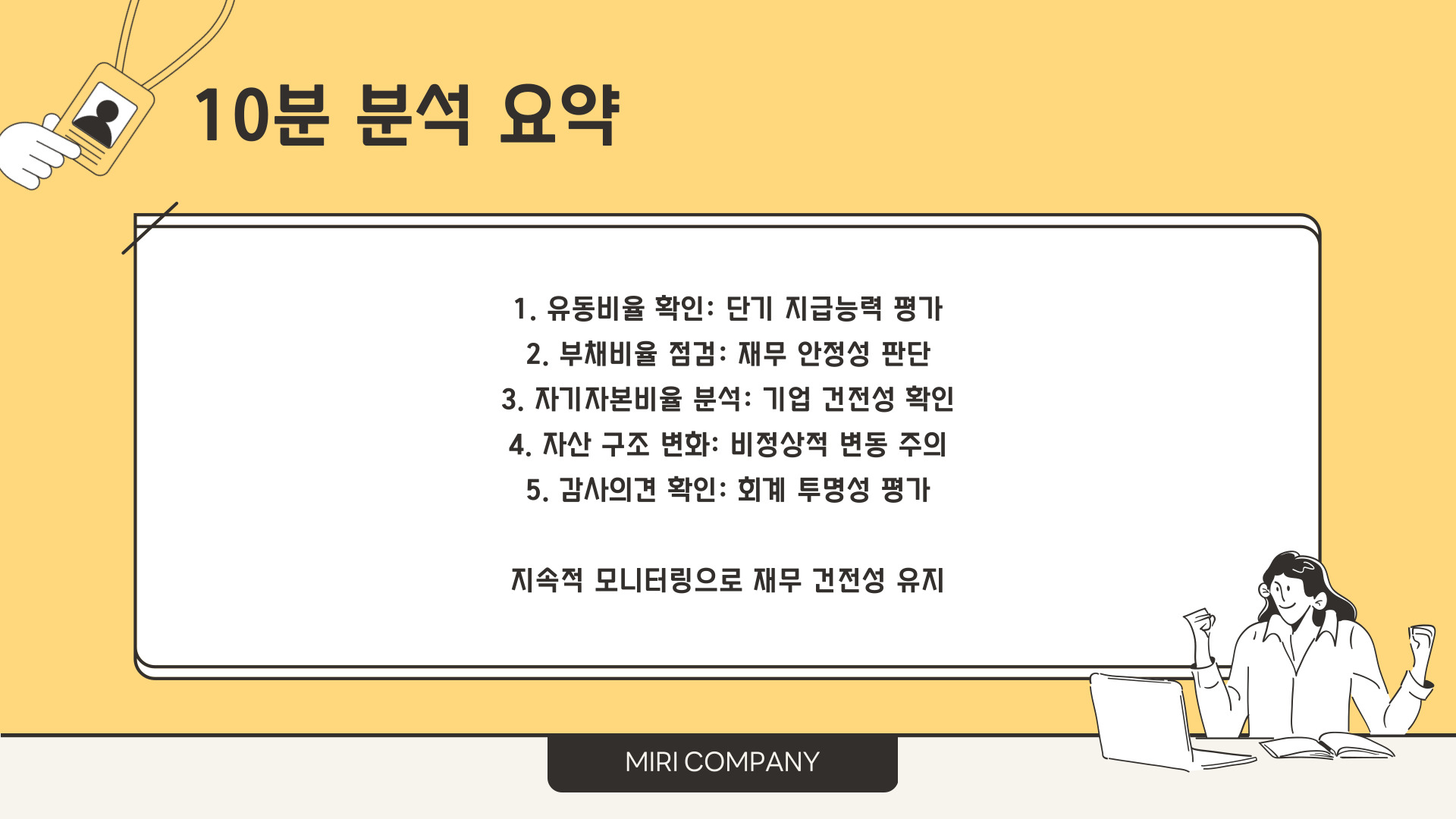 - 유동비율 확인: 기업의 유동자산이 유동부채보다 많아야 단기 지급 능력이 있습니다. 이를 통해 기업의 유동성을 평가할 수 있습니다.