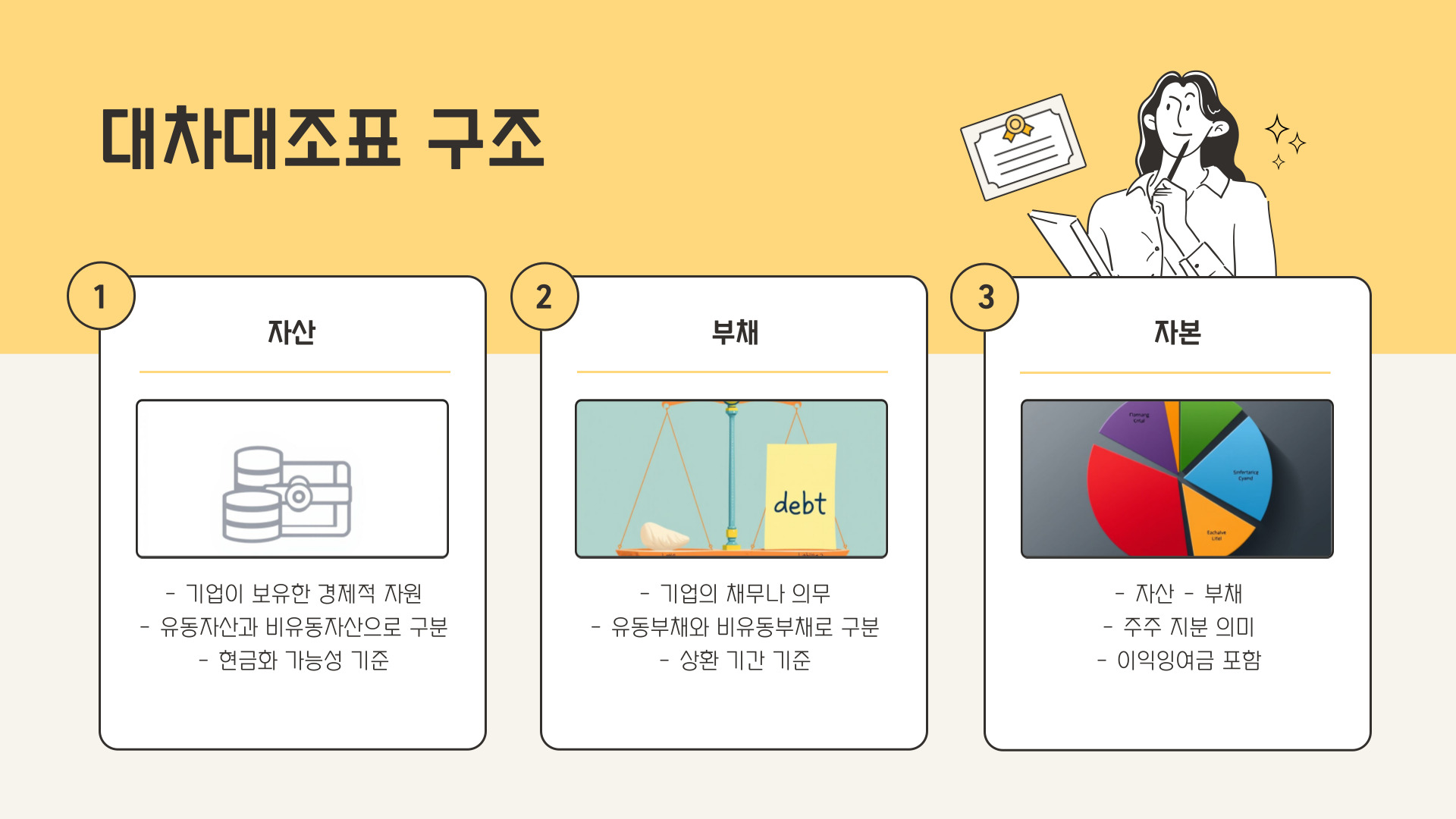 - 자산, 부채, 자본의 세 가지 주요 요소로 구성됨