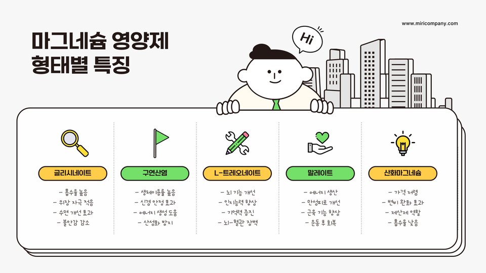 - 마그네슘의 효능: 근육 이완, 스트레스 감소, 심혈관 건강, 뼈 건강