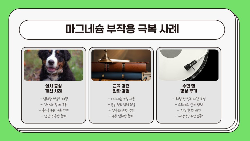 마그네슘 영양제는 인체 건강에 중요한 역할을 하지만, 부작용이 발생할 수 있습니다. 따라서, 각 개인의 건강 상태와 필요에 맞춘 복용법과 건강한 생리학적 반응을 유도하기 위한 방법이 필수적입니다. 위의 팁과 주의사항을 참고하여 자신에게 맞는 방법으로 마그네슘 영양제를 활용하세요.
