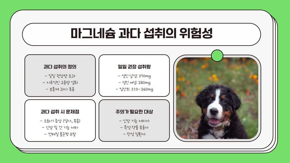 나아가 마그네슘이 너무 많이 섭취되면 혈압을 낮추는 효과가 있어 저혈압을 유발할 수 있습니다. 특히, 이미 혈압이 낮은 분들은 각별히 주의해야 합니다. 이러한 분들은 지속적인 모니터링이 필요합니다.