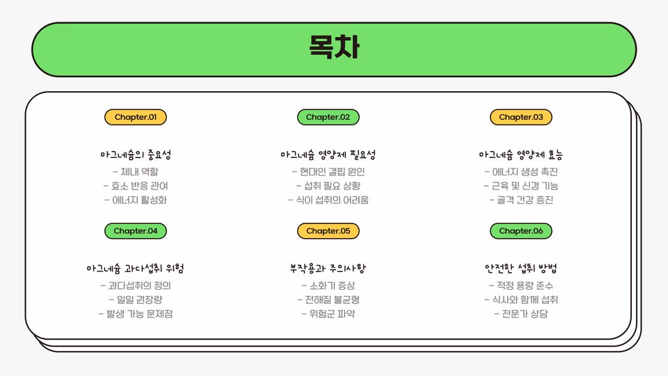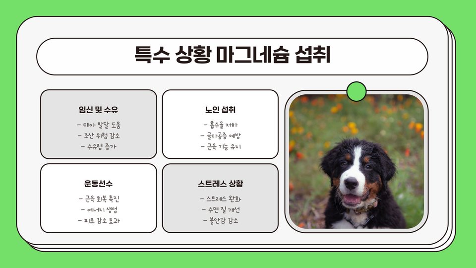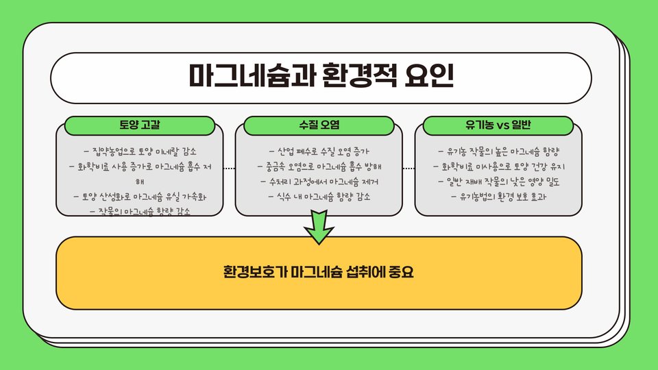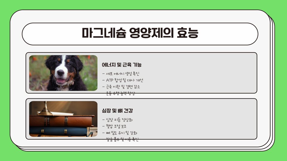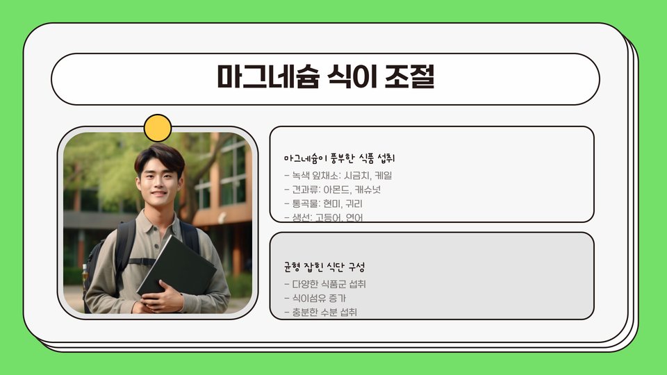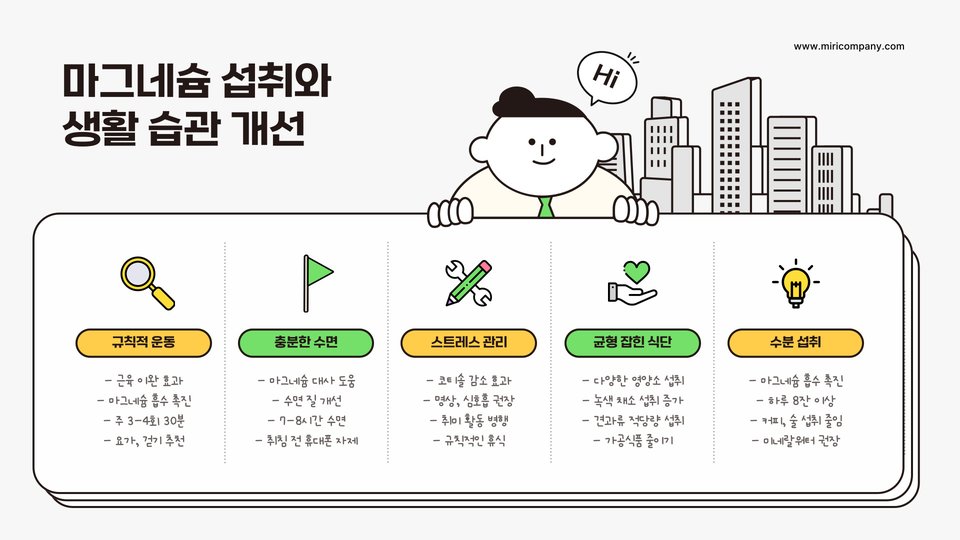- 마그네슘의 효능: 근육 이완, 스트레스 감소, 심혈관 건강, 뼈 건강