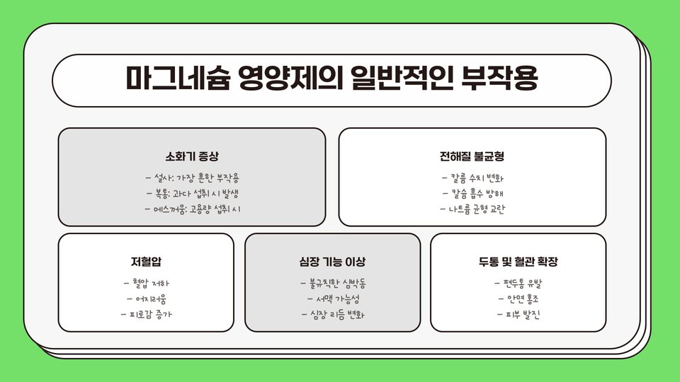 마그네슘 영양제를 섭취할 때 발생할 수 있는 주요 부작용은 다음과 같습니다. 첫째, 설사가 매우 흔하게 발생할 수 있습니다. 이는 마그네슘의 과다 섭취로 인해 장의 운동성이 증가하기 때문입니다. 둘째, 복부 경련이나 불편감 역시 나타날 수 있습니다. 이러한 증상은 체내에서 마그네슘이 과도하게 작용할 때 발생됩니다.