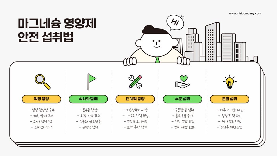 마그네슘 영양제를 안전하게 섭취하기 위해서는 몇 가지 꿀팁을 따르는 것이 중요합니다. 첫째, 적정량을 준수하세요. 일반적으로 성인은 하루에 300~400mg의 마그네슘을 섭취하는 것이 권장됩니다. 둘째, 마그네슘을 식사와 함께 섭취하면 부작용을 줄일 수 있습니다. 음식과 함께 섭취하면 소화가 원활해지고 흡수율이 높아집니다.