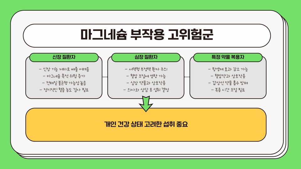 나아가 마그네슘이 너무 많이 섭취되면 혈압을 낮추는 효과가 있어 저혈압을 유발할 수 있습니다. 특히, 이미 혈압이 낮은 분들은 각별히 주의해야 합니다. 이러한 분들은 지속적인 모니터링이 필요합니다.