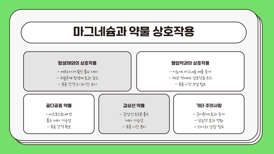 마그네슘 영양제를 복용할 때는 특정 약물과의 상호작용에도 주의해야 합니다. 특히, 칼슘 보충제나 항생제와 함께 복용할 경우, 마그네슘의 흡수율이 줄어들 수 있습니다. 이 경우에도, 건강 전문가와의 상담이 필요합니다.