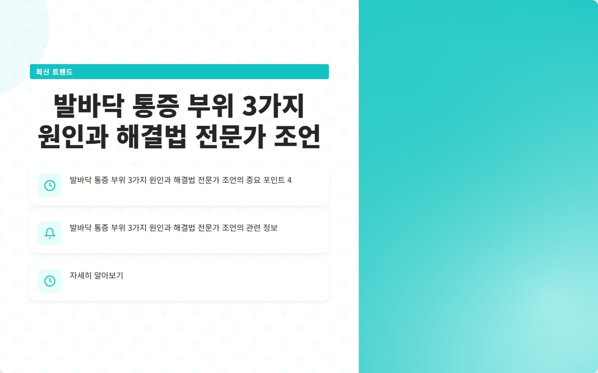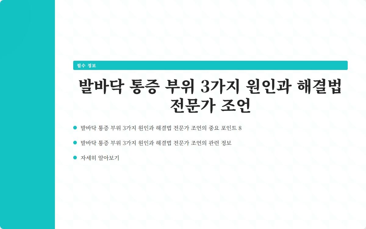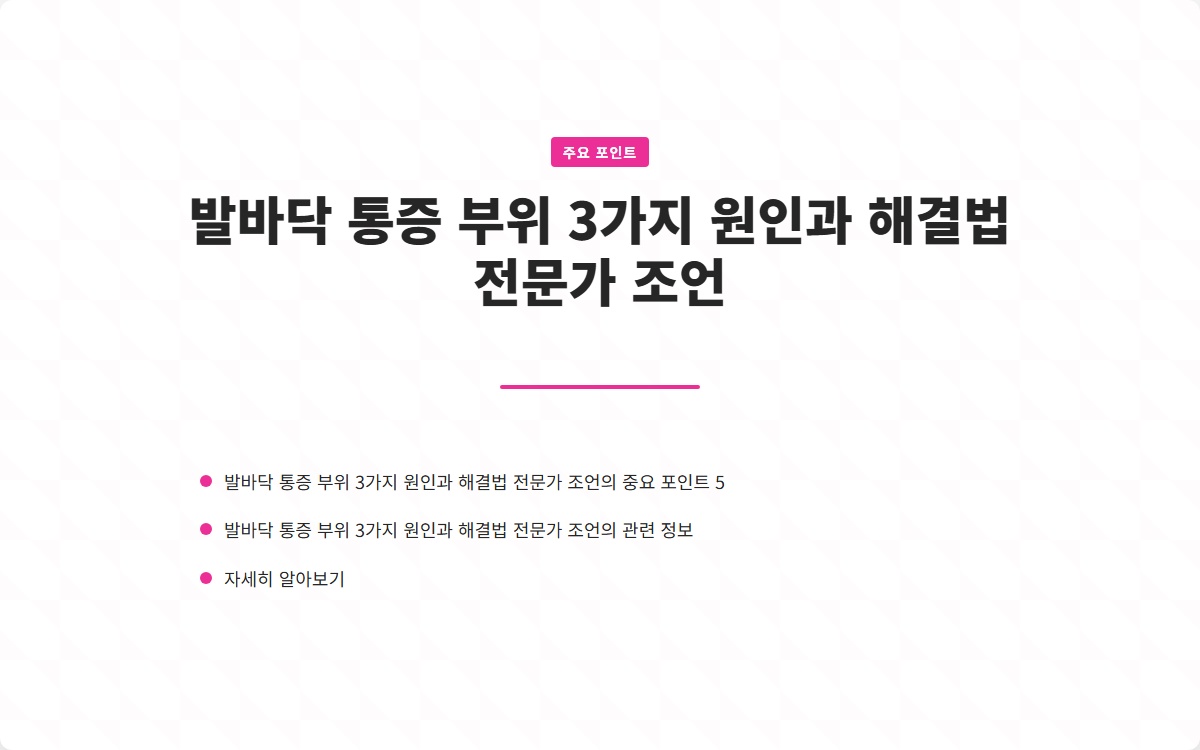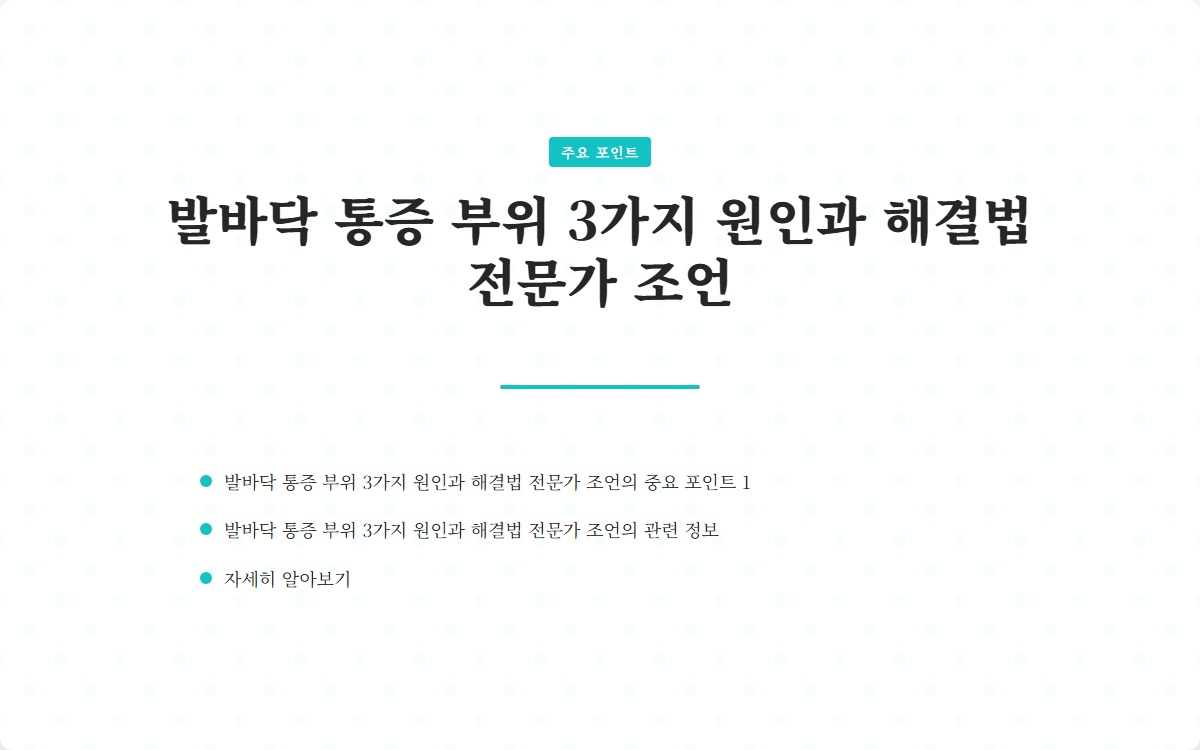 핵심 요약: 발바닥 통증은 다양한 원인이 있으며, 부위별 관리 방법이 필요합니다. 통증이 지속될 경우 전문의의 상담이 중요합니다.