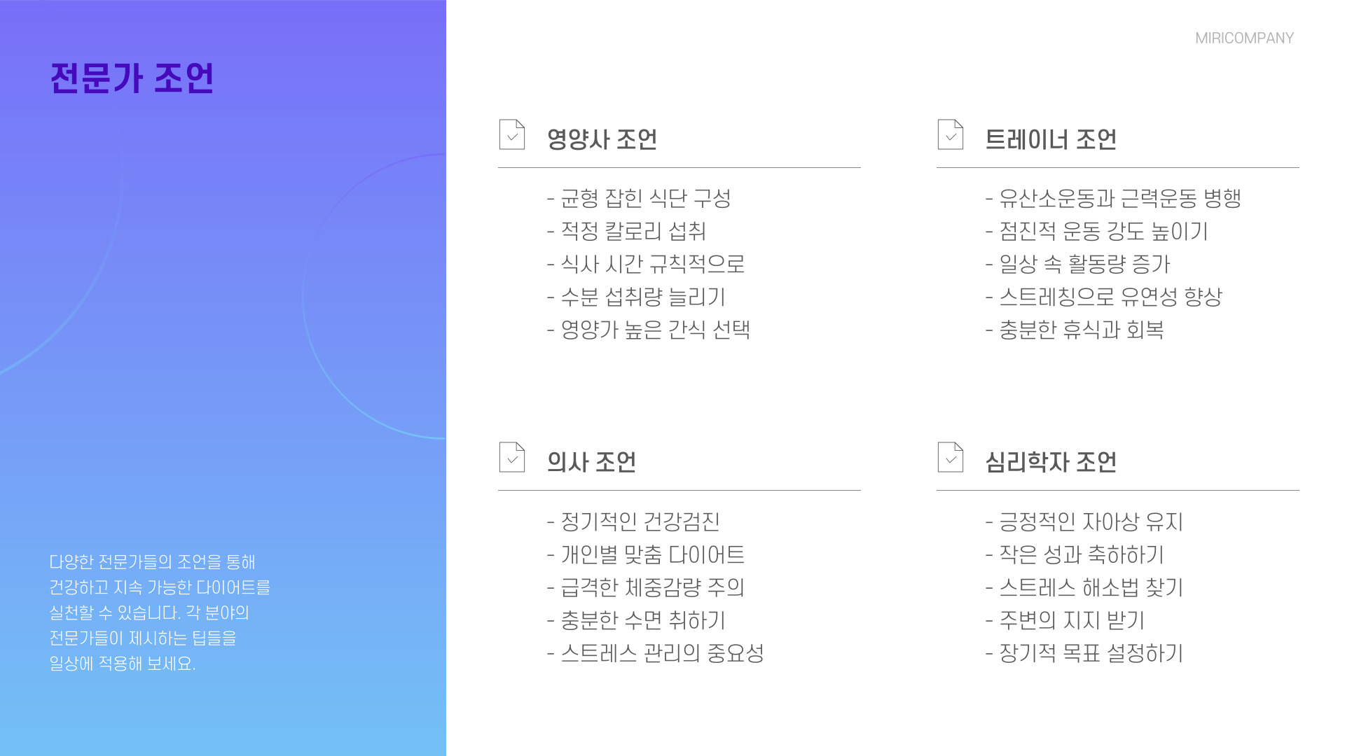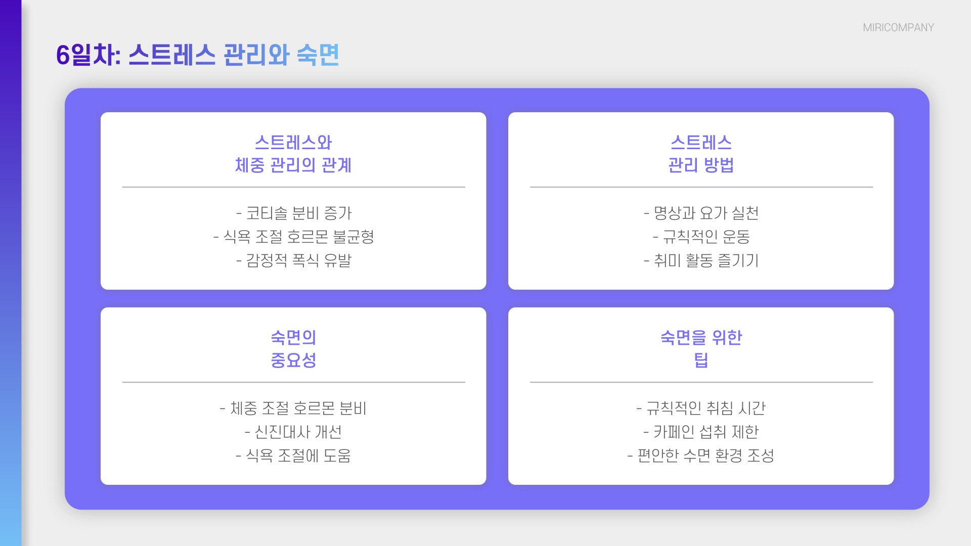 | 스트레스 관리 | 명상, 요가로 스트레스 완화 |