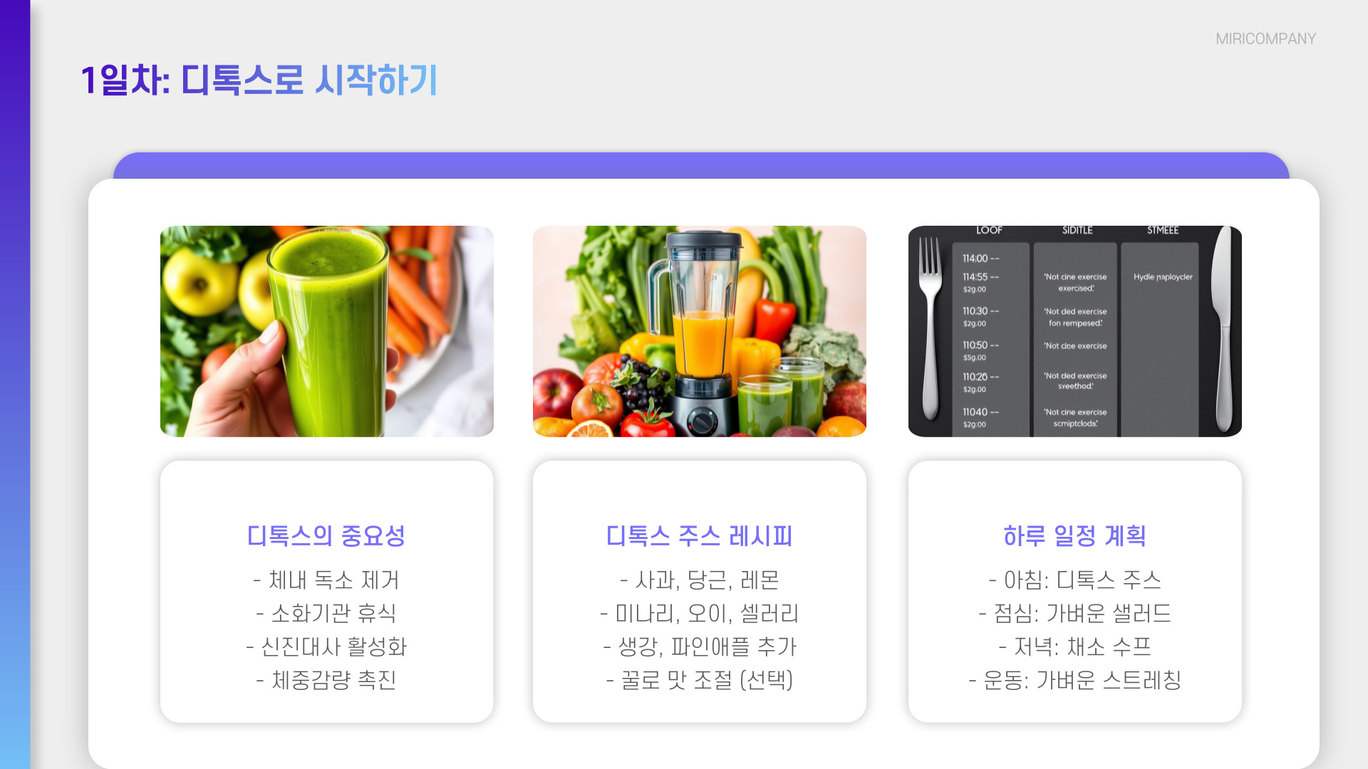 첫 번째 날은 식단 조절을 토대로 시작합니다. 가공식품과 설탕의 섭취를 줄이는 것이 중요합니다. 대신, 신선한 과일과 채소, 단백질이 풍부한 음식을 선택하세요. 이러한 음식들은 소화가 잘 되고, 뱃살을 줄이는 데 도움을 줍니다.