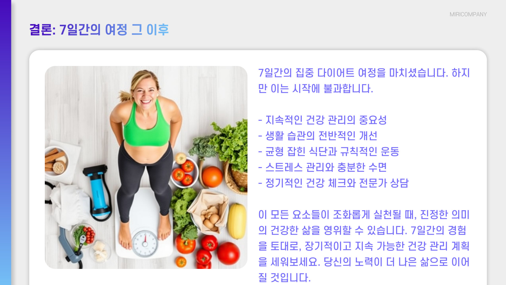 이 과정을 통해 희망적인 변화를 경험했다면, 더 긴 기간 동안 이 생활습관을 지속하도록 노력해보세요. 꾸준함이 가장 중요한 성공의 열쇠입니다.