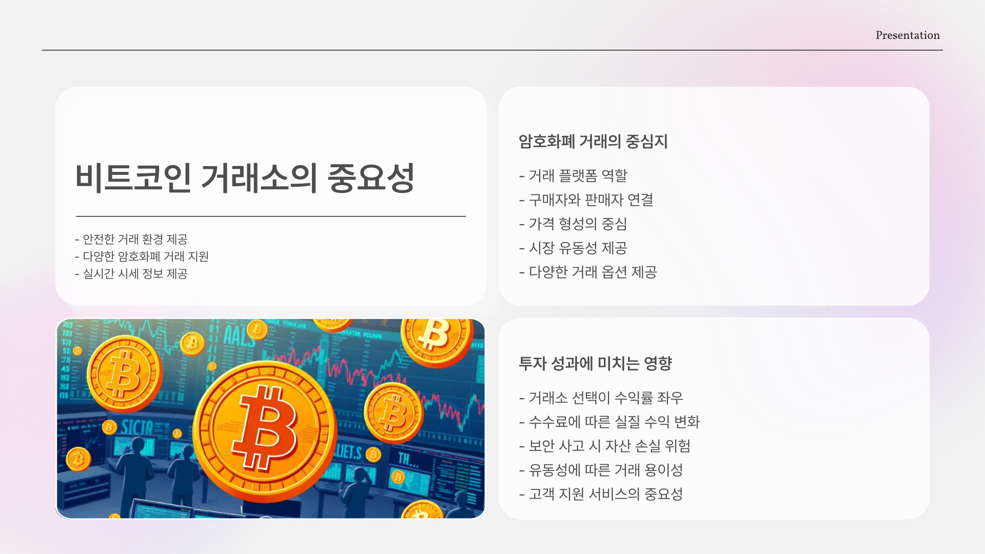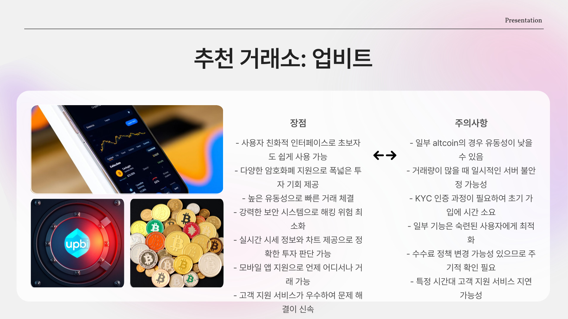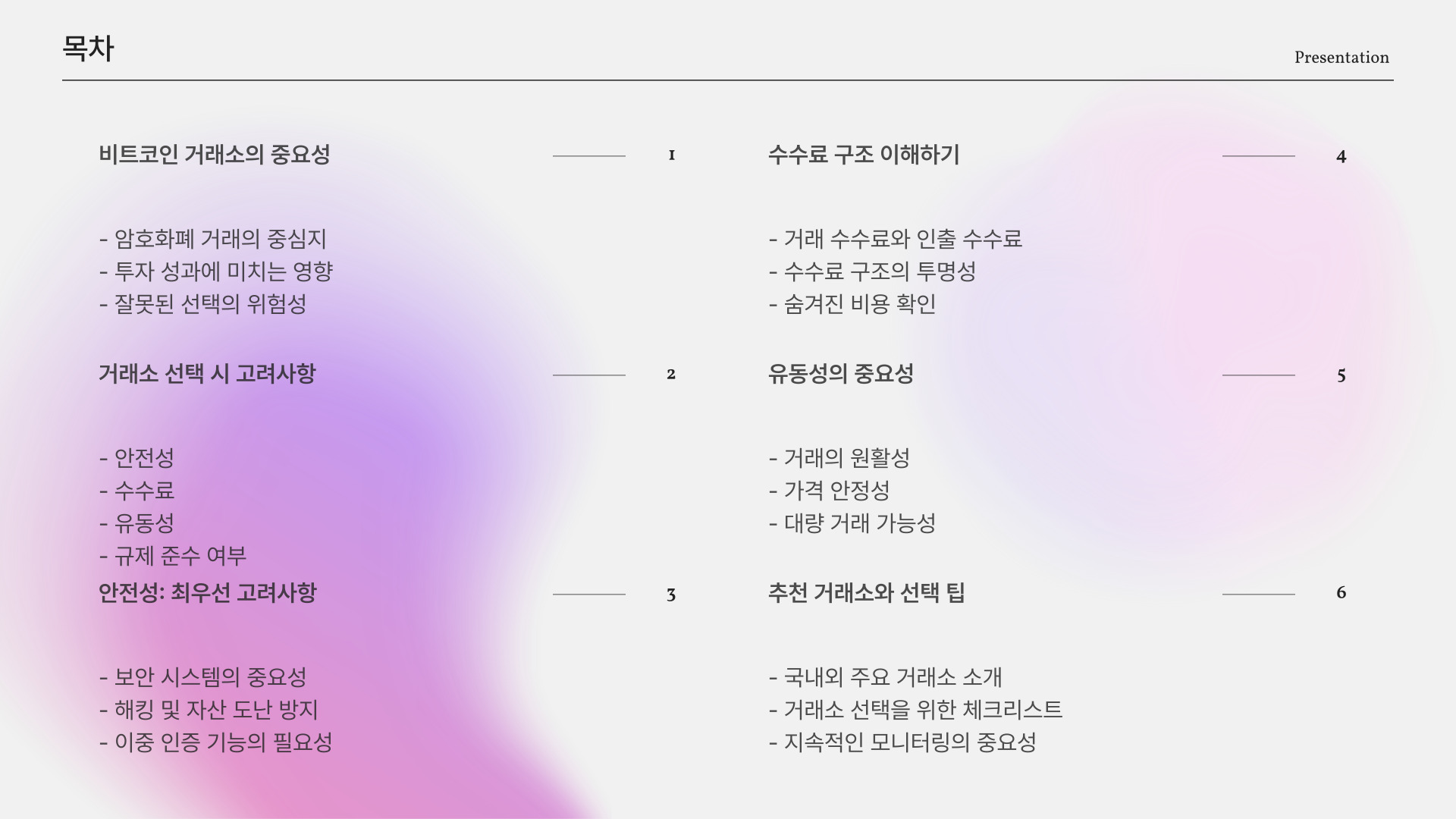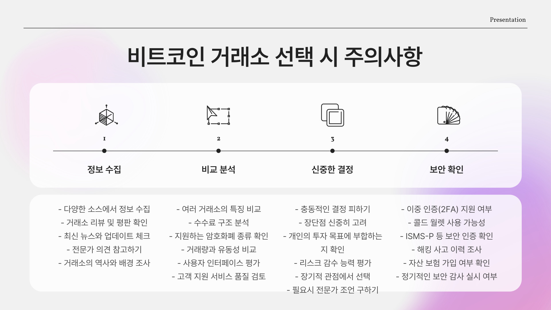 | 고객 지원 | 신속한 문제 해결이 가능한 고객 지원 서비스를 제공하는 거래소를 선택하세요. |