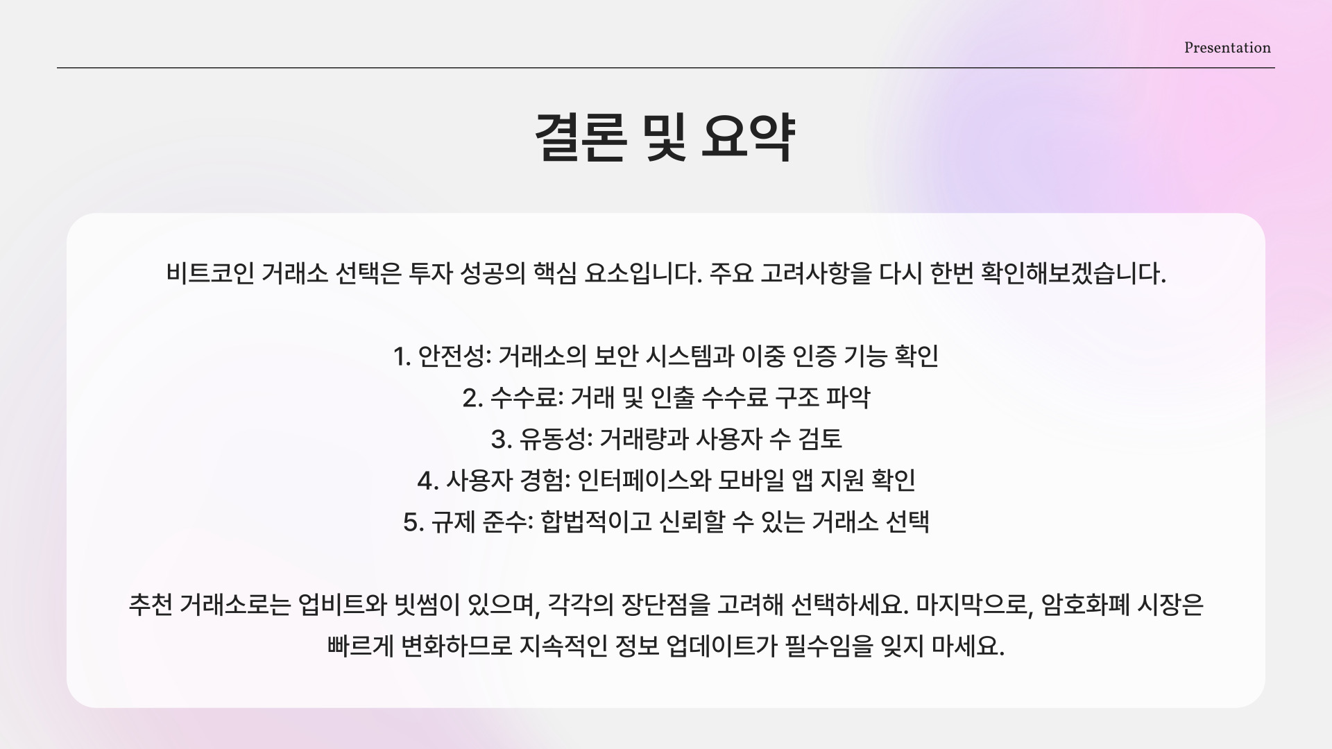 비트코인 거래소 선택은 투자 성공의 중요한 요소입니다. 위에서 소개한 안전성, 수수료, 유동성 등 다양한 요소를 고려하여 신중하게 선택하십시오. 또한, 추천 거래소인 업비트와 빗썸을 통해 시작해 보세요. 성공적인 비트코인 거래를 위해 정보를 지속적으로 업데이트하고, 새로운 거래소의 출현도 주목해야 합니다.