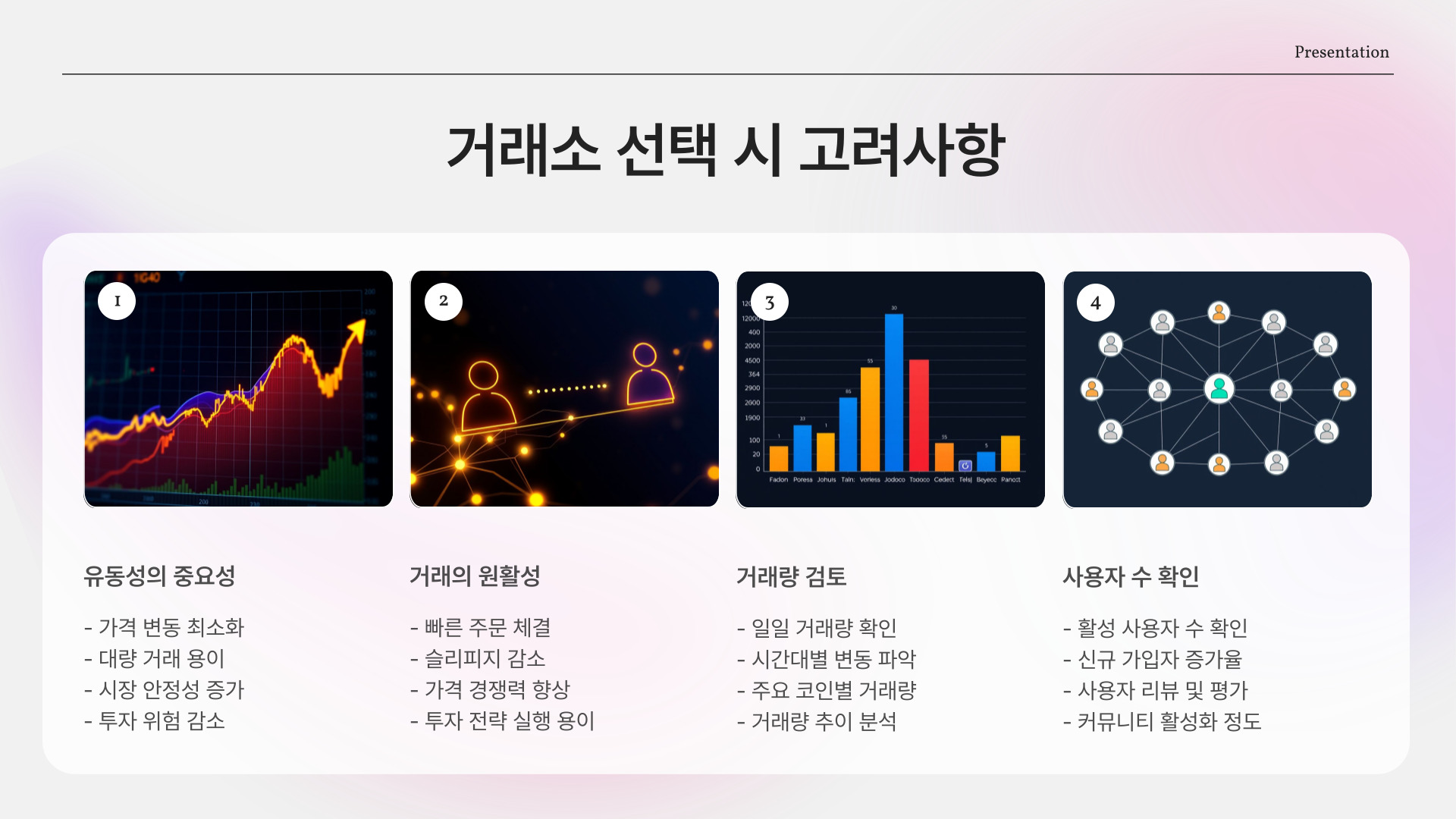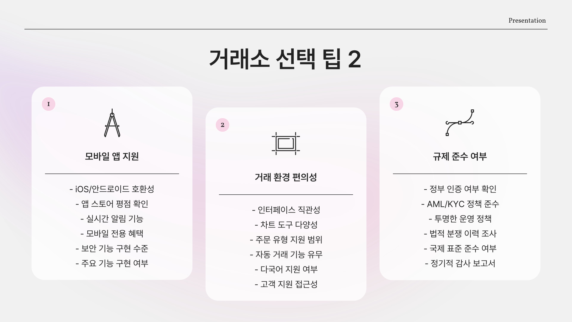 | 고객 지원 | 신속한 문제 해결이 가능한 고객 지원 서비스를 제공하는 거래소를 선택하세요. |