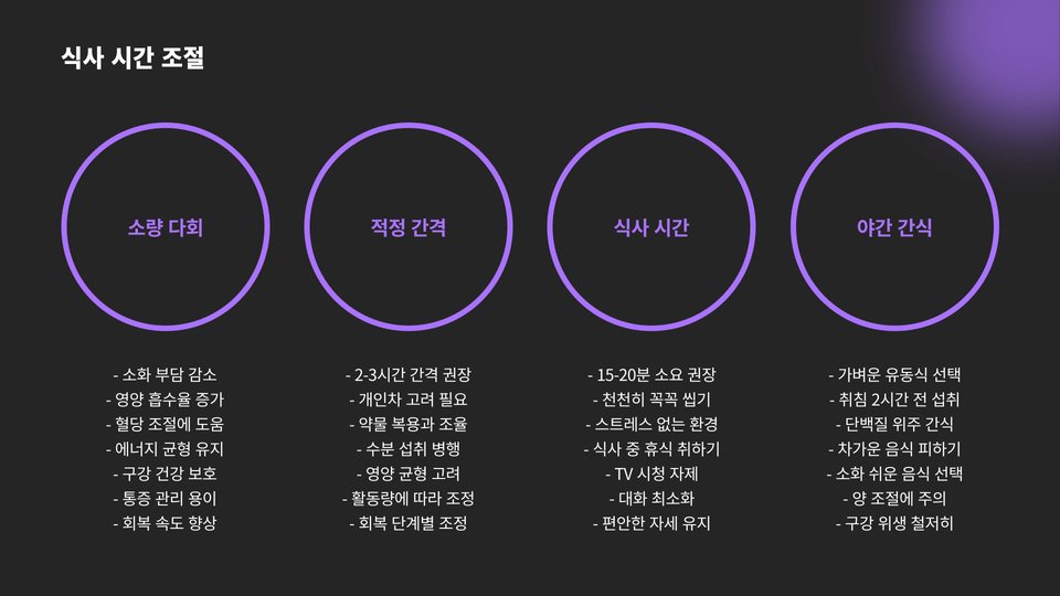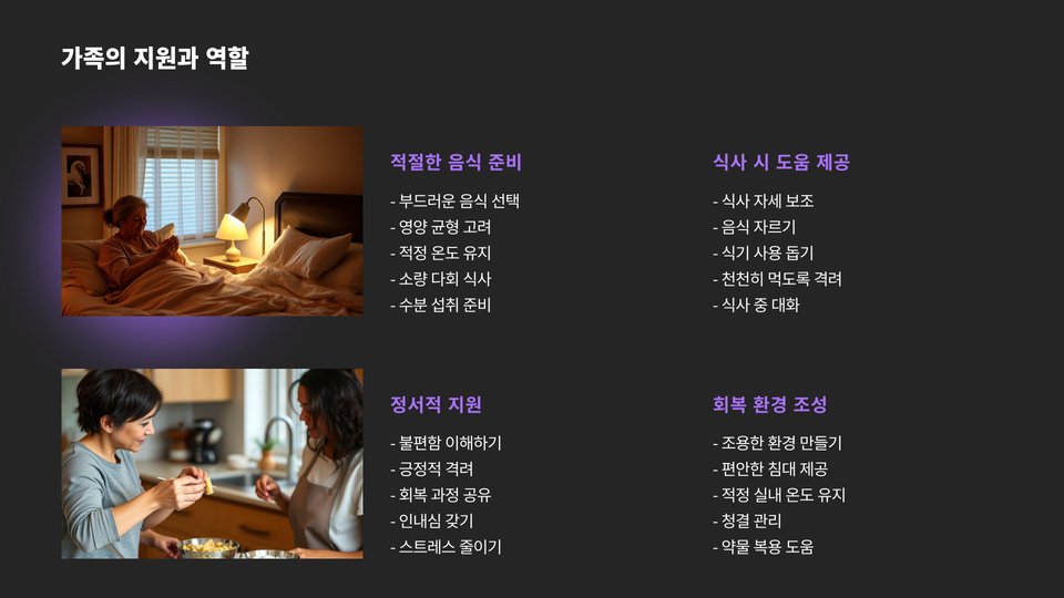 - 부드러운 음식 위주 (스프, 죽 등)