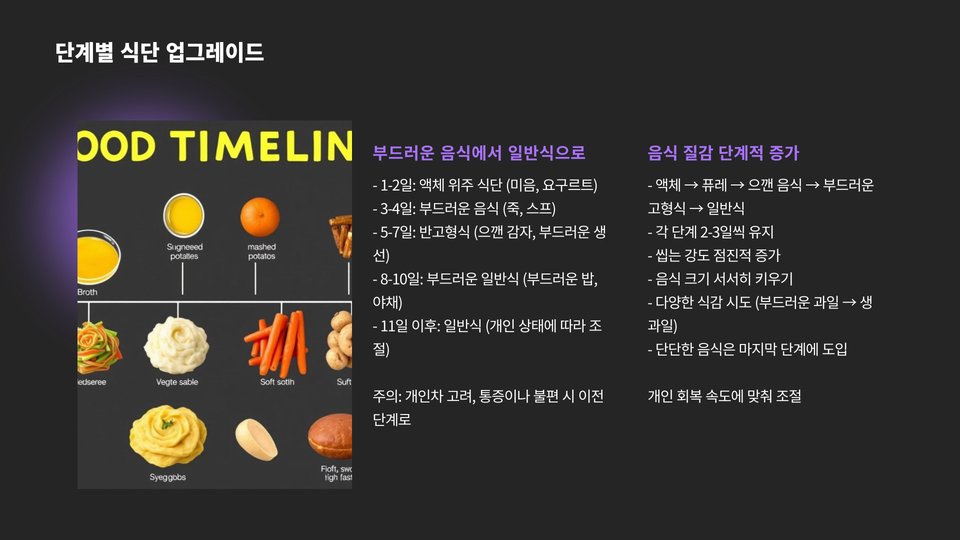 - 스무디: 과일과 채소를 갈아 만든 스무디는 영양을 보충하면서도 부드럽습니다.