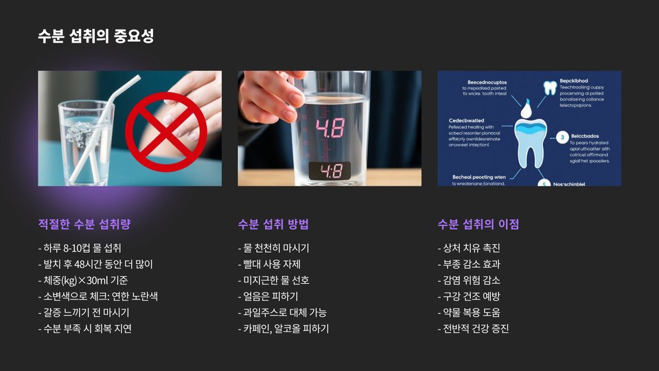 또한, 발치 후 48시간 이내에는 음료를 마실 때 흡입하지 않는 것이 중요합니다. 빨대 사용은 혈액응고를 방해할 수 있는 공기를 흡입하게 할 수 있기 때문에 절대 피해야 합니다.