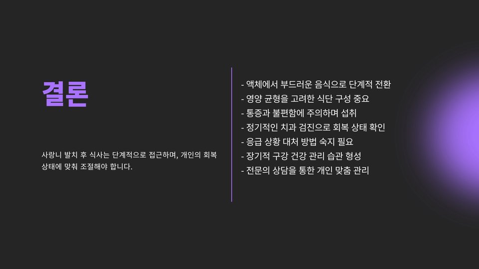 사랑니 발치 후 적절한 식사 관리는 회복을 돕는 중요한 요소입니다. 본 포스트에서 제안한 식사 메뉴와 주의사항을 염두에 두고 건강하고 빠른 회복을 위한 길잡이로 삼으시길 바랍니다. 부드러운 음식의 중요성을 잊지 마시고, 상처 부위를 자극하지 않도록 주의하셔야 합니다. 질문이나 추가 정보가 필요하다면 전문의와 상담하는 것도 좋은 방법입니다.