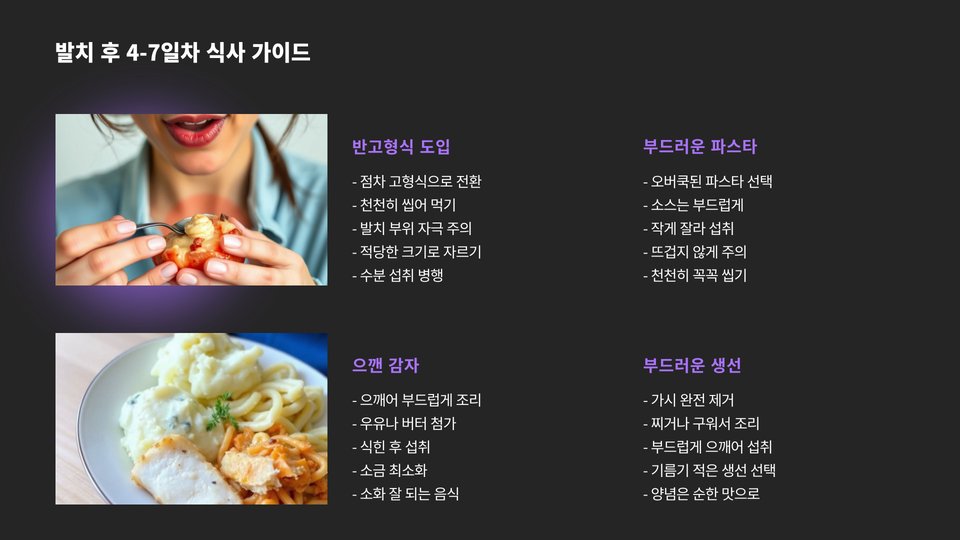 또한, 음식을 씹는 방식도 주의해야 합니다. 발치한 쪽에서 음식을 씹지 않도록 하여 상처가 덜 자극받도록 해야 합니다. 처음에는 한 쪽에서만 음식을 씹고, 2-3일 후에는 상태에 따라 반대편에서 식사를 시도할 수 있습니다.