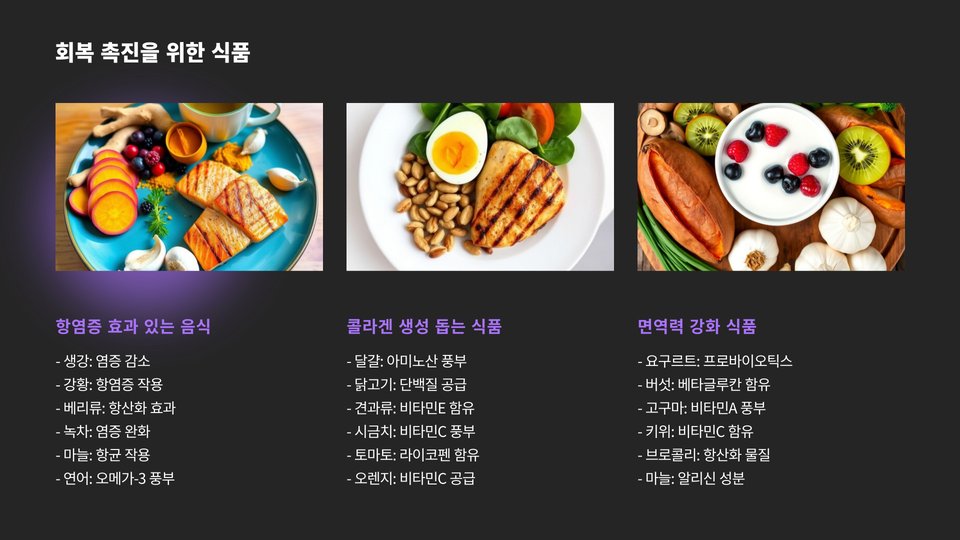 또한, 가공식품이나 설탕이 많은 음식은 회복 과정에 악영향을 줄 수 있습니다. 인스턴트 음식은 일반적으로 영양가가 낮고, 염증을 자극할 수 있으며, 체내 회복 속도를 늦출 수 있습니다. 이로 인해, 상처가 더 오랜 기간 아플 수 있습니다.