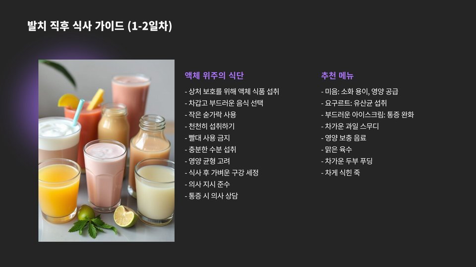 사랑니 발치 후에는 어떤 음식을 먹는 것이 좋을까요? 전문가들은 다음과 같은 음식을 추천합니다: