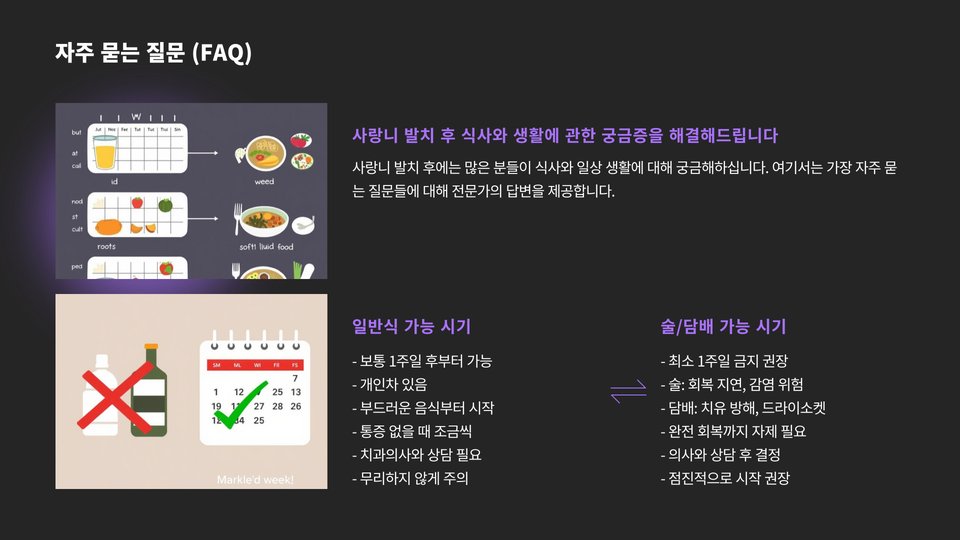 사랑니 발치 후 올바른 식사를 통해 빠른 회복을 도모할 수 있습니다. 부드럽고 영양가 높은 음식을 선택하고, 식사 후 구강 청결을 유지하는 것이 중요합니다. 이 외에도 전문가의 조언을 참고하여 건강한 회복을 이루시기 바랍니다.