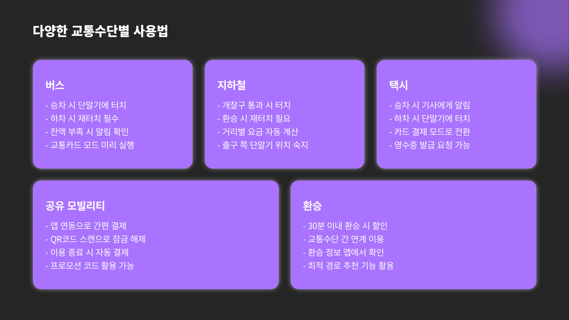 예를 들어, 출근길에 모바일로 교통카드를 통해 쉽게 승차할 수 있어 시간 절약의 효과를 느낄 수 있습니다. 또한, 지갑에 여러 카드가 들어있을 필요가 없으니 분실 위험도 줄어듭니다.