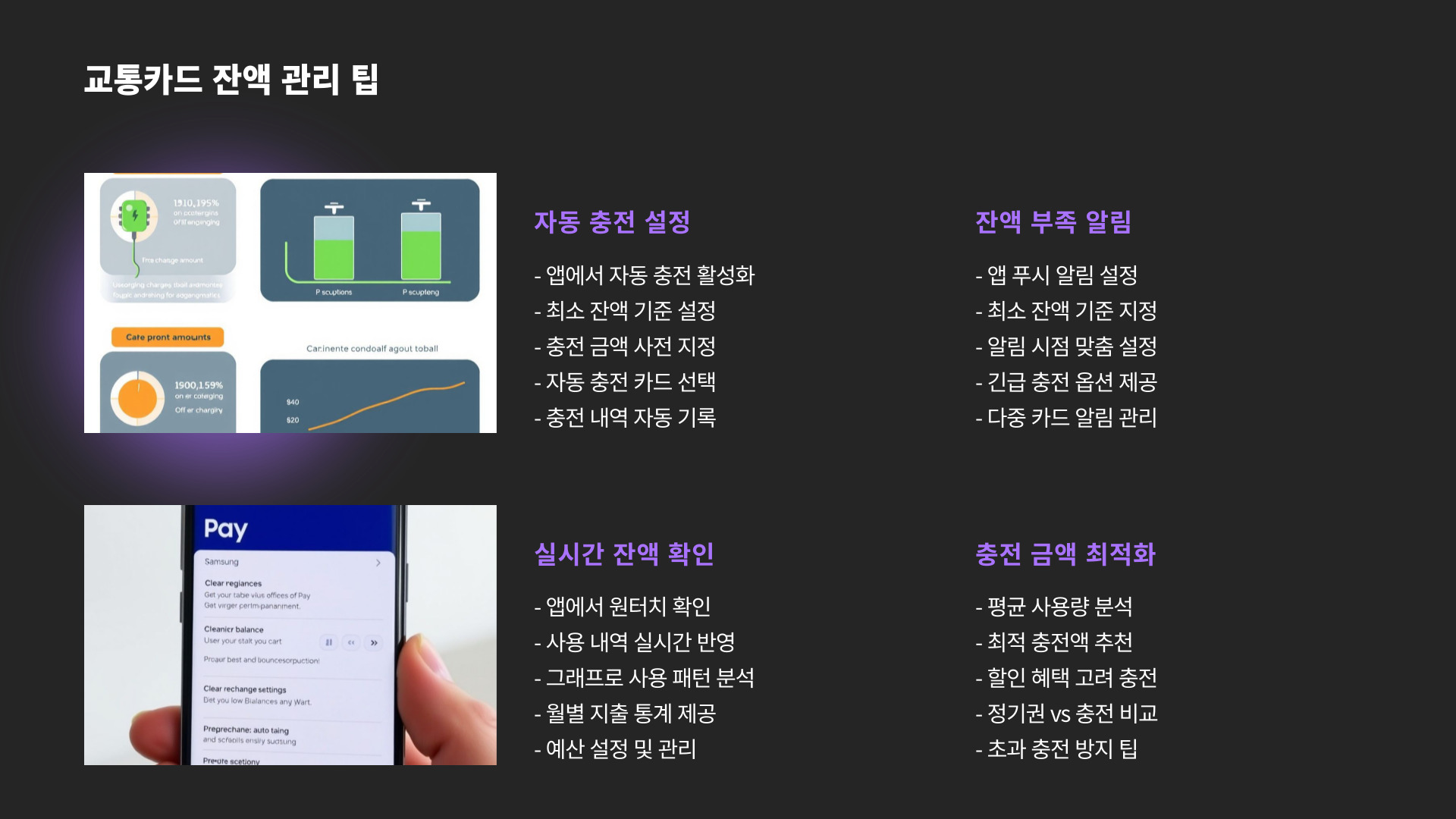 잔액이 얼마 남지 않았을 경우, 적절한 시점에 충전할 수 있도록 미리 계획할 수 있습니다. 모바일 간편 결제를 통해 충전이 가능하므로 지하철역의 복잡한 충전기를 이용할 필요도 없습니다.