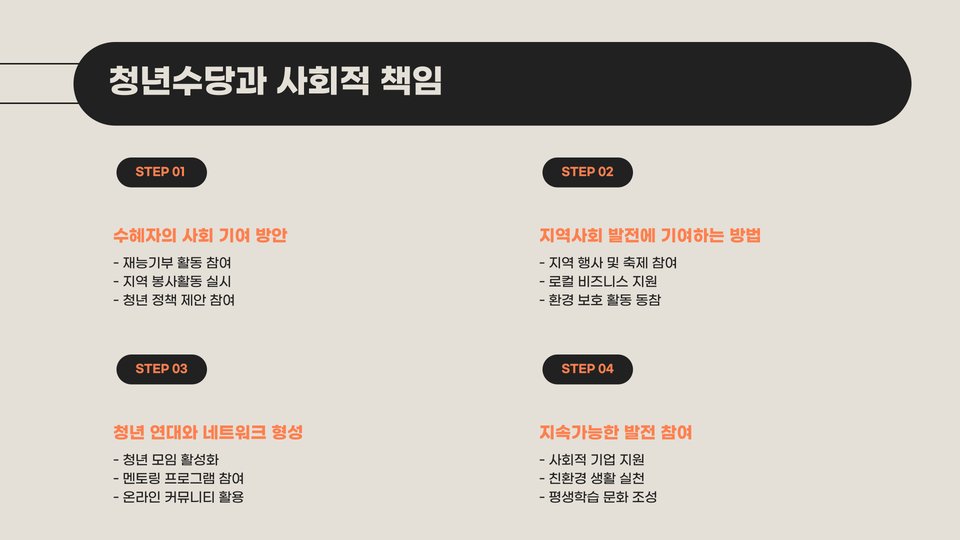 부가적으로, 청년 수당을 받는 과정에서 서로의 경험을 공유할 수 있는 커뮤니티가 형성되기도 합니다. 지원금을 받는 청년들은 서로의 성공 사례나 노하우를 나누며, 취업 준비에 있어 큰 도움이 되는 사람과의 네트워킹을 할 수 있습니다. 이는 단순한 금전적 지원을 넘어 사회적 연대 의식을 강화하는데 크게 기여합니다.