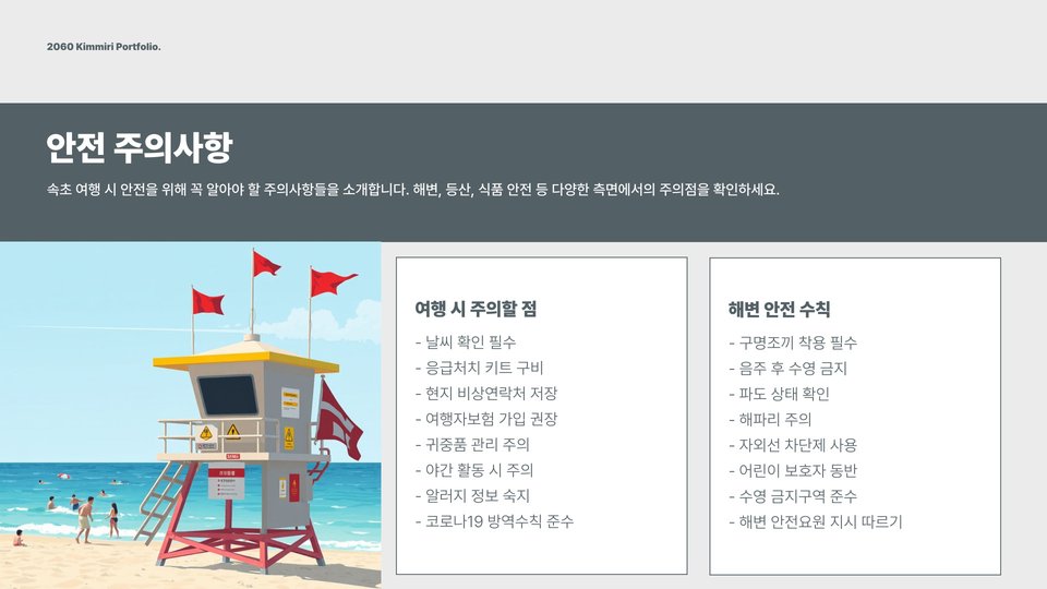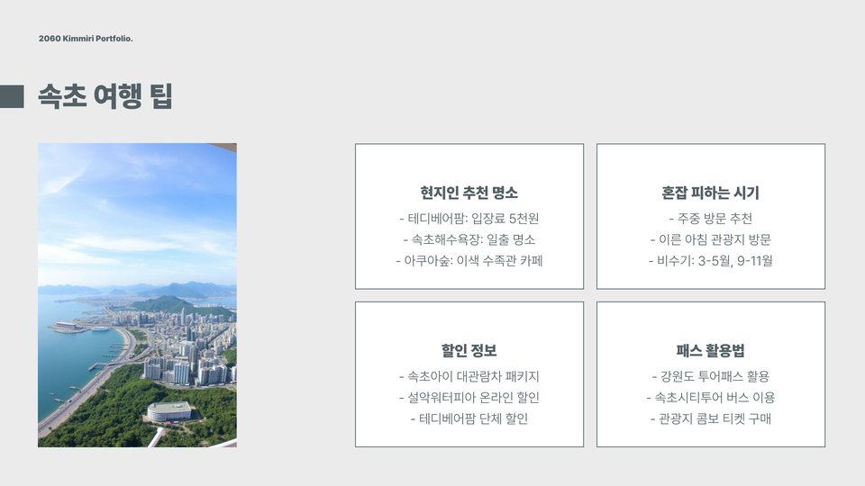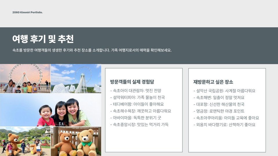 이번 포스팅을 통해 소개한 속초 가볼만한곳은 아이와 함께하는 여행에 최적화된 장소들입니다. 각 장소마다 고유의 매력과 즐길 거리가 많으니, 가족과 함께 소중한 추억을 만들어 보시기 바랍니다. 속초는 여러분을 언제나 환영합니다!