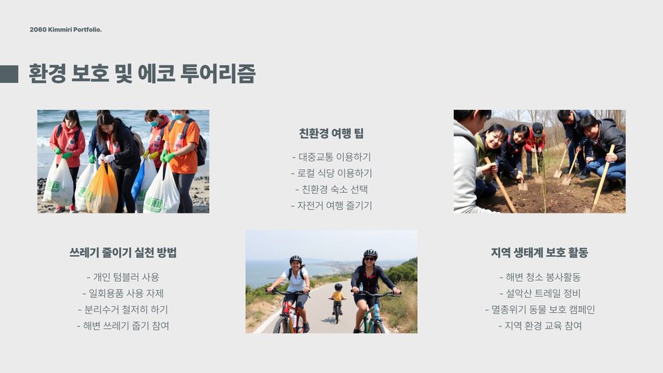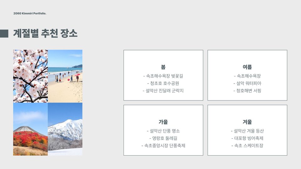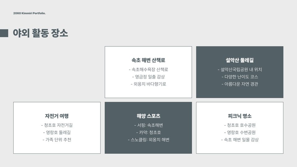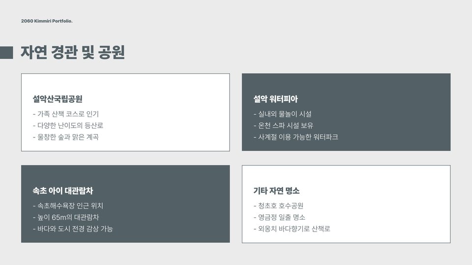 - 설악산 국립공원: 등산과 자연 관찰, 케이블카 이용 가능