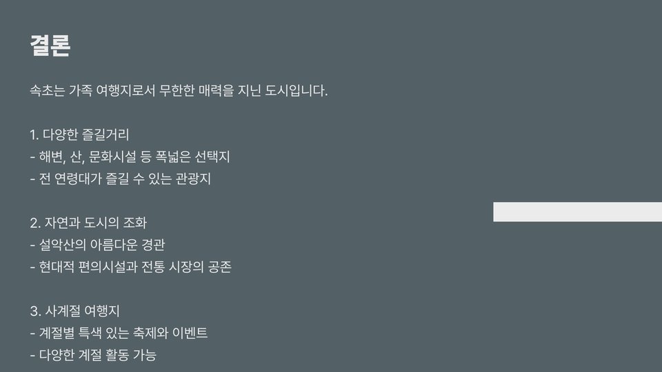 이번 포스팅을 통해 소개한 속초 가볼만한곳은 아이와 함께하는 여행에 최적화된 장소들입니다. 각 장소마다 고유의 매력과 즐길 거리가 많으니, 가족과 함께 소중한 추억을 만들어 보시기 바랍니다. 속초는 여러분을 언제나 환영합니다!