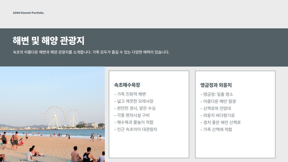 - 속초 해변: 물놀이와 모래놀이, 편의시설 완비