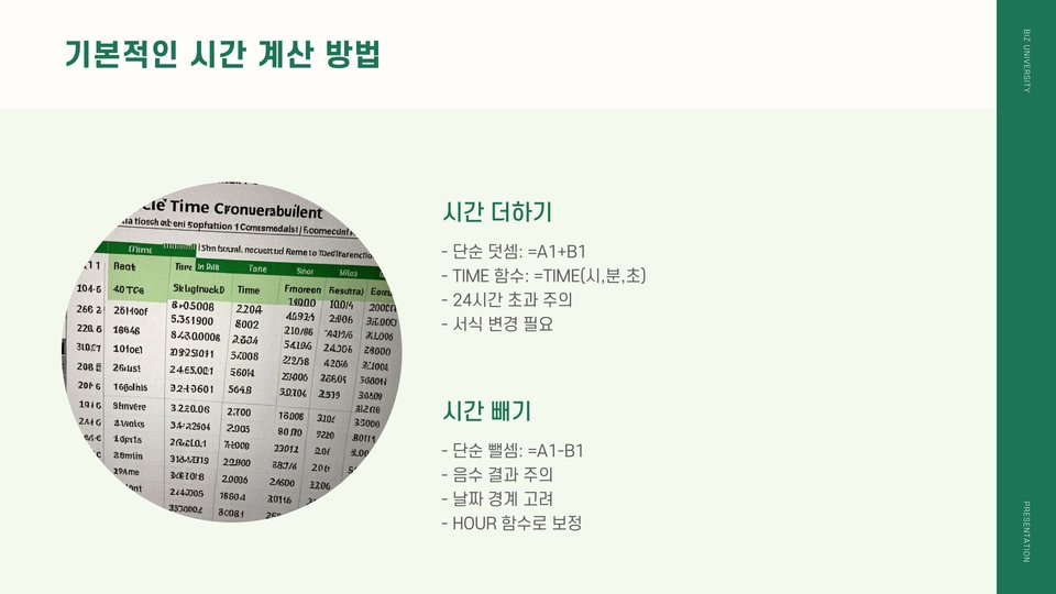 엑셀에서는 시간 계산을 보다 정확하게 하기 위해 시간 형식을 설정하는 것이 중요합니다. 셀을 선택한 후, 마우스 오른쪽 버튼을 클릭하고 '셀 서식'을 선택합니다. 여기서 '시간' 옵션을 선택하면 다양한 시간 형식 중에서 선택할 수 있습니다.