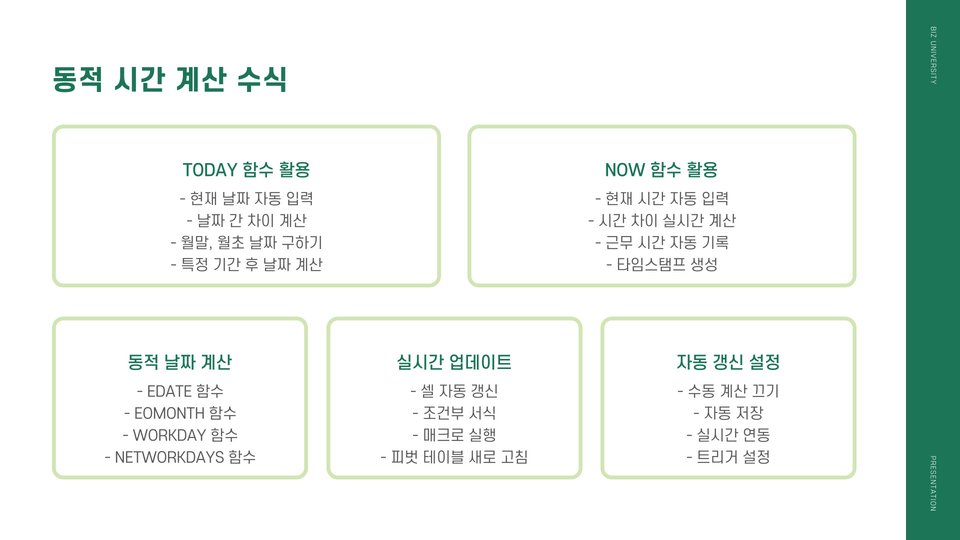 - 특정 시간 추가: =A1 + TIME(2,30,0) 사용