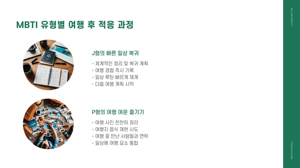 여행 계획을 세우는 단계에서 본인의 MBTI 유형을 분석하여 여행 목표와 일정을 구성해보세요. 효율적인 실행 방법은 각 개인의 성향에 맞는 맞춤형 계획을 세우는 것입니다. 예를 들어, ENTP 유형은 다양한 액티비티를 포함한 관광 일정을 선호하며, 여러 활동을 할 수 있는 장소를 선택하는 것이 좋습니다.