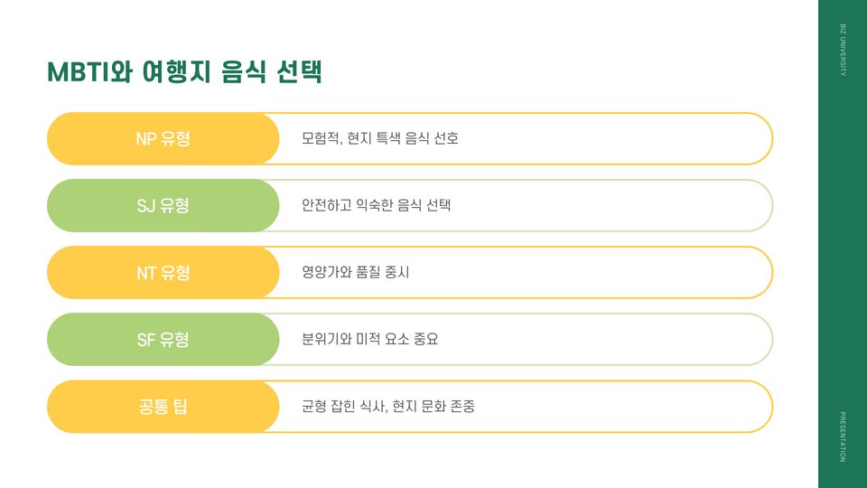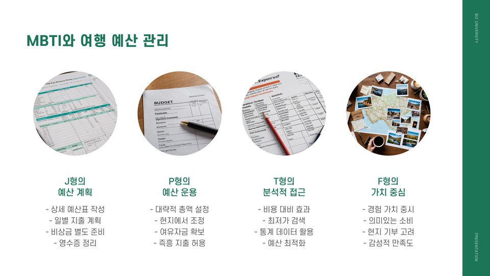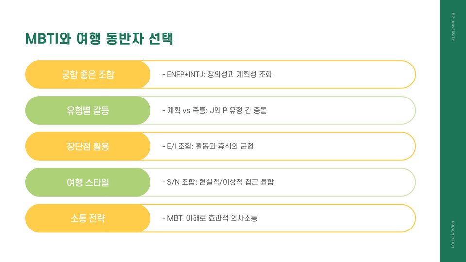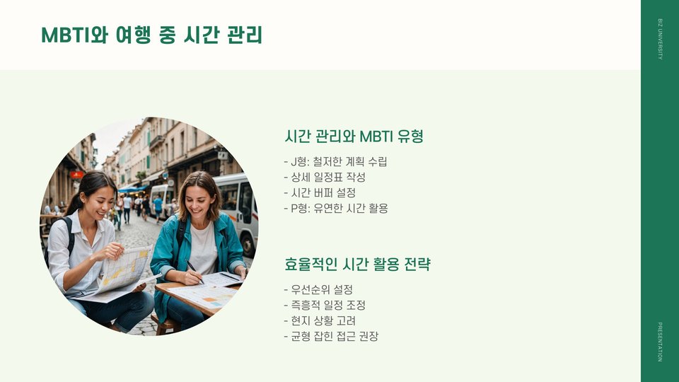 여행 계획을 세우는 단계에서 본인의 MBTI 유형을 분석하여 여행 목표와 일정을 구성해보세요. 효율적인 실행 방법은 각 개인의 성향에 맞는 맞춤형 계획을 세우는 것입니다. 예를 들어, ENTP 유형은 다양한 액티비티를 포함한 관광 일정을 선호하며, 여러 활동을 할 수 있는 장소를 선택하는 것이 좋습니다.