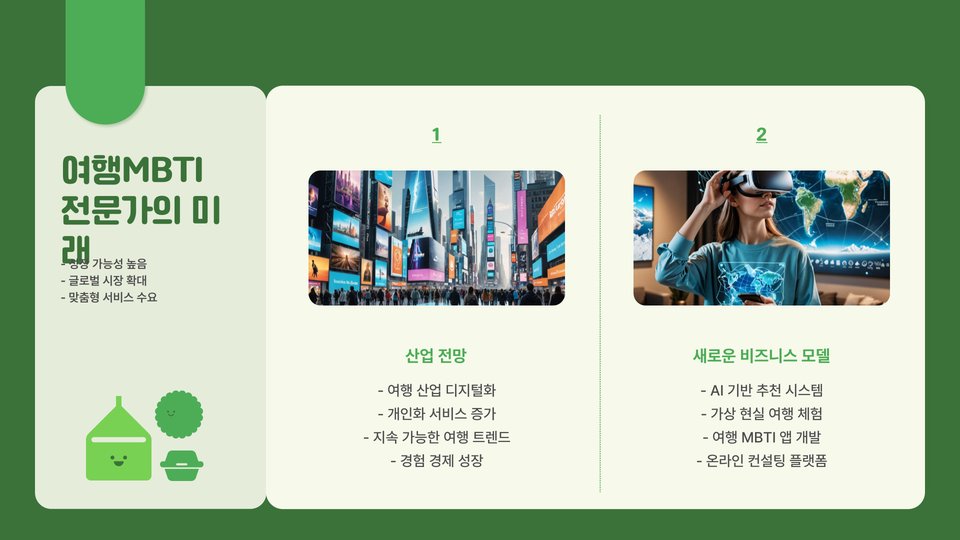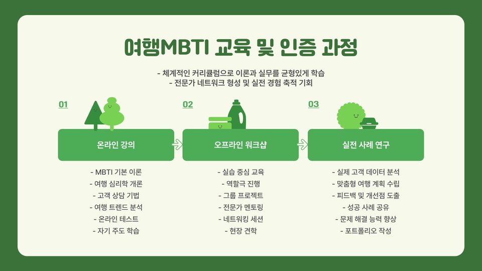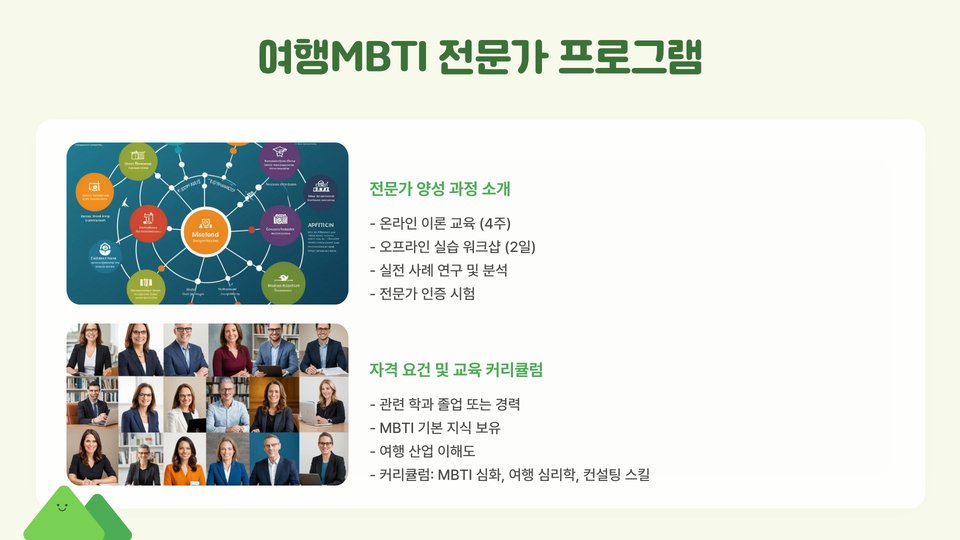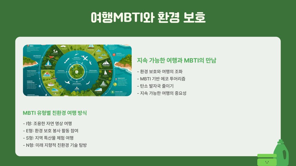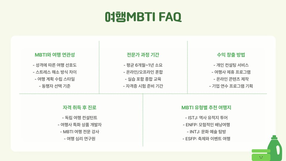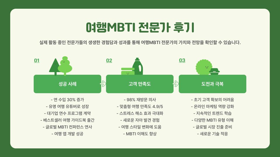 여행은 단순한 이동이 아닌, 삶의 중요한 경험 중 하나입니다. 여행MBTI를 통해 나의 성격에 맞는 여행을 계획하고, 전문가의 도움으로 더욱 풍성한 여행 경로를 만들어 보세요. 앞으로의 여행이 더욱 특별하고 의미 있는 경험이 될 것입니다.