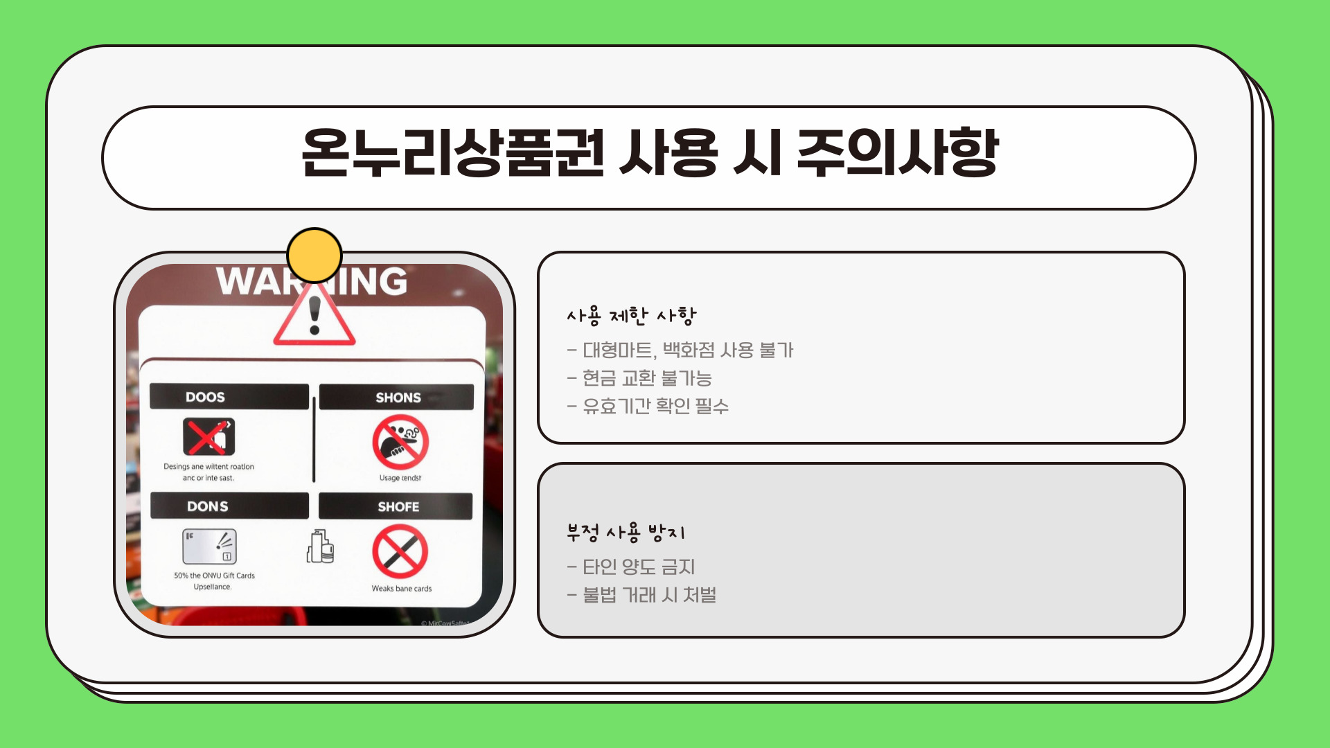 온누리상품권은 사용이 간편합니다. 상품권을 구매한 후, 원하는 가게에서 상품권을 제시하면 됩니다. 단, 사용 가능한 매장인지 미리 확인하는 것이 중요합니다. 일부 매장에서는 온누리상품권을 사용할 수 없을 수 있습니다. 사용하기 전에 매장에 문의하거나, 온누리상품권 공식 웹사이트에서 사용 가능 매장을 확인하는 것이 좋습니다.