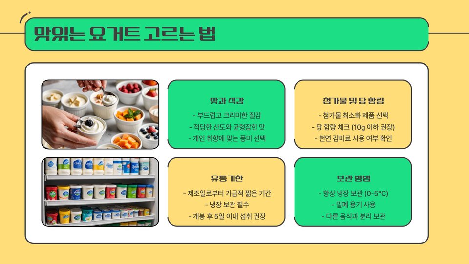 - 첨가물과 당도를 확인하여 건강한 요거트를 선택하는 것이 중요합니다.