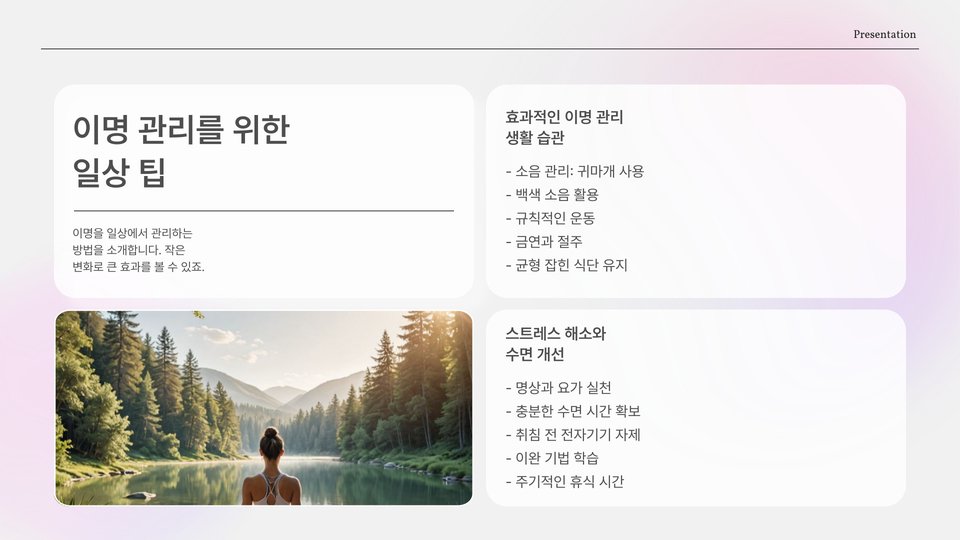 이명을 효과적으로 관리하기 위해서는 일상생활에서의 주의가 필요합니다. 소음 노출을 최소화하고, 귀를 보호하는 것이 중요합니다. 또한, 정기적으로 청력 검사를 받는 것도 추천합니다. 이명은 조기에 발견하고 관리할수록 더 나은 결과를 얻을 수 있습니다. 스트레스 관리와 충분한 휴식도 이명의 증상 완화에 중요한 요소입니다.
